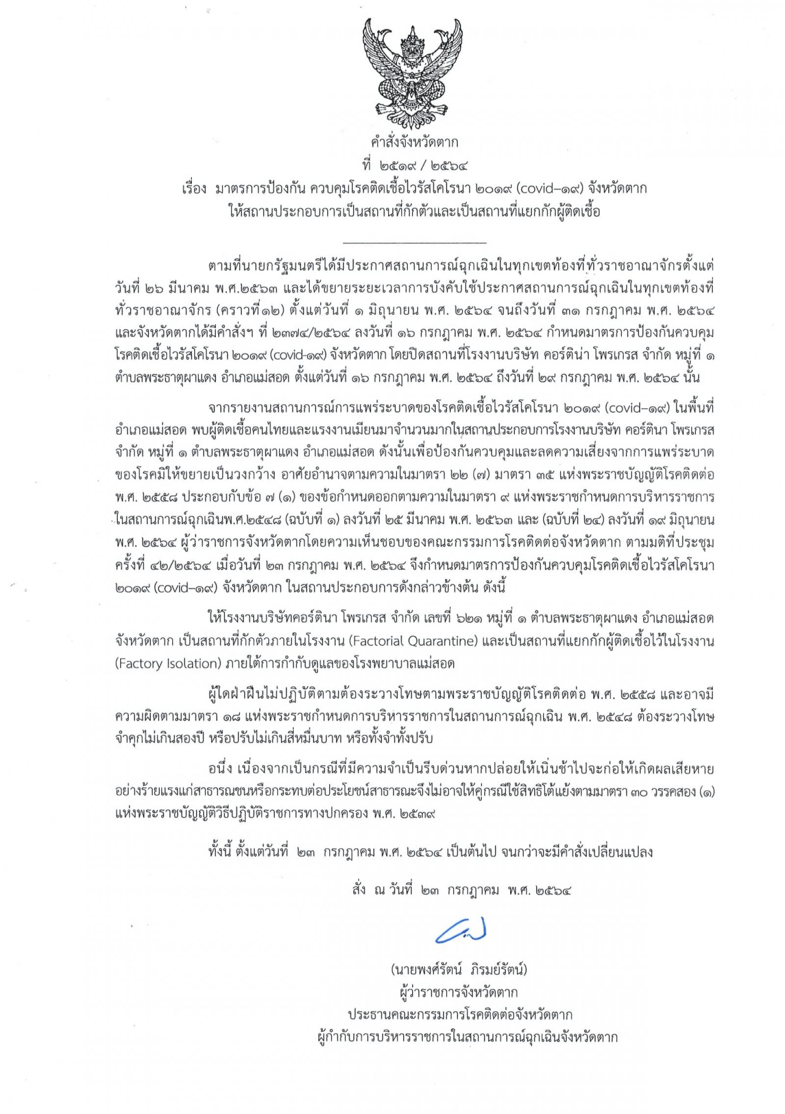 คำสั่งจังหวัดตาก ที่ 2519/2564 เรื่อง มาตรการป้องกัน ควบคุมโรคติดเชื้อไวรัสโคโรนา 2019 (โควิด-19) จังหวัดตาก ให้สถานประกอบการเป็นสถานที่กักตัวและเป็นสถานที่แยกกักผู้ติดเชื้อ