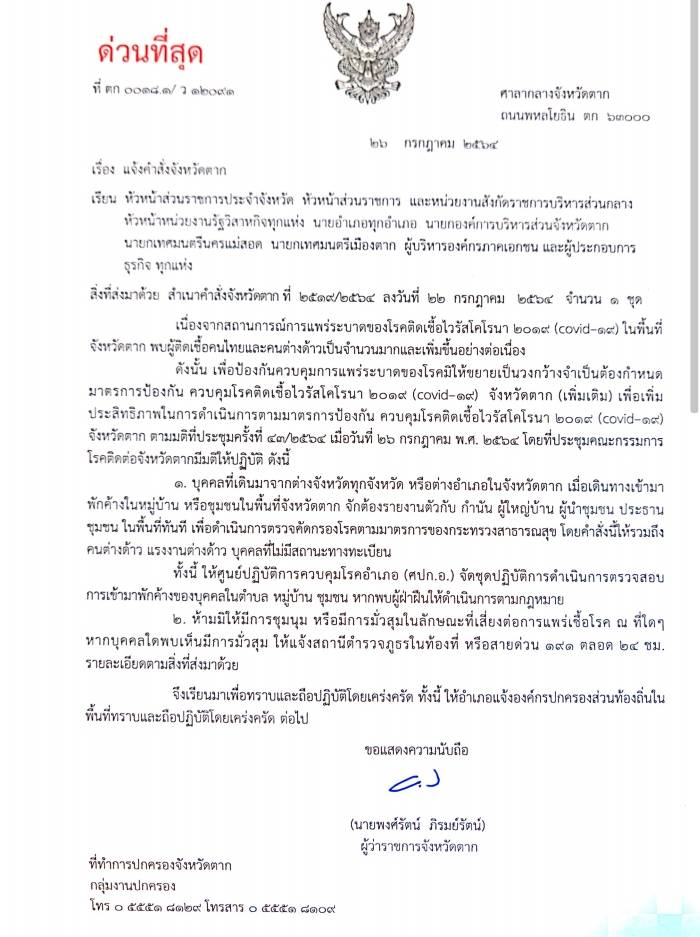 คำสั่งจังหวัดตาก เรื่อง มาตรการป้องกัน ควบคุมโรคติดเชื้อไวรัสโคโรนา 2019 (โควิด-19) จังหวัดตาก (เพิ่มเติม) เพื่อเพิ่มประสิมธิภาพในการดำเนินการตามมาตรการป้องกัน ควบคุมโรคติดเชื้อไวรัสโคโรนา 2019 (โควิด-19)
