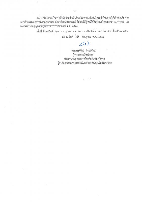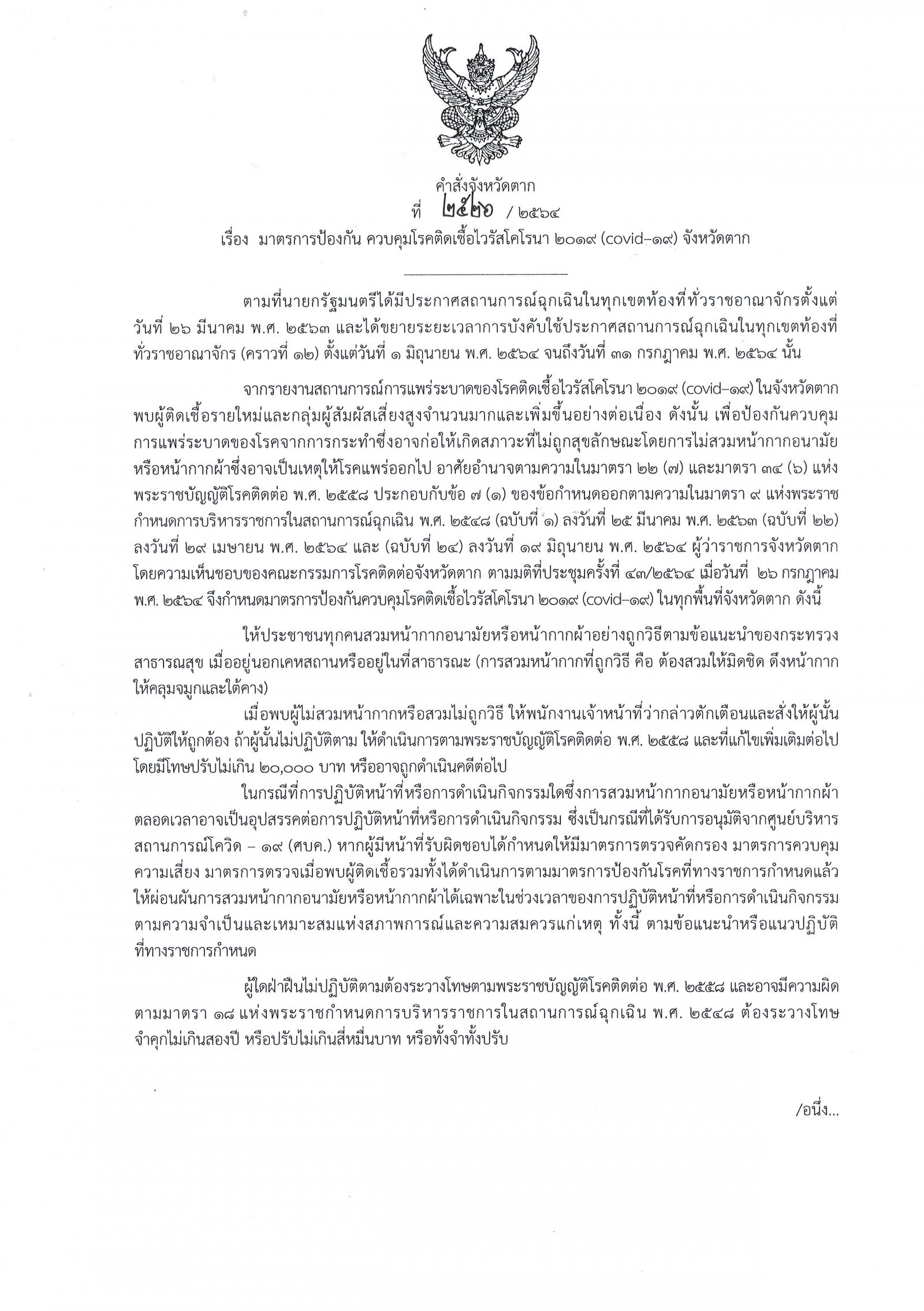 คำสั่งจังหวัดตาก ที่ 2526/2564 เรื่อง มาตรการป้องกัน ควบคุมโรคติดเชื้อไวรัสโคโรนา 2019 (โควิด-19) จังหวัดตาก