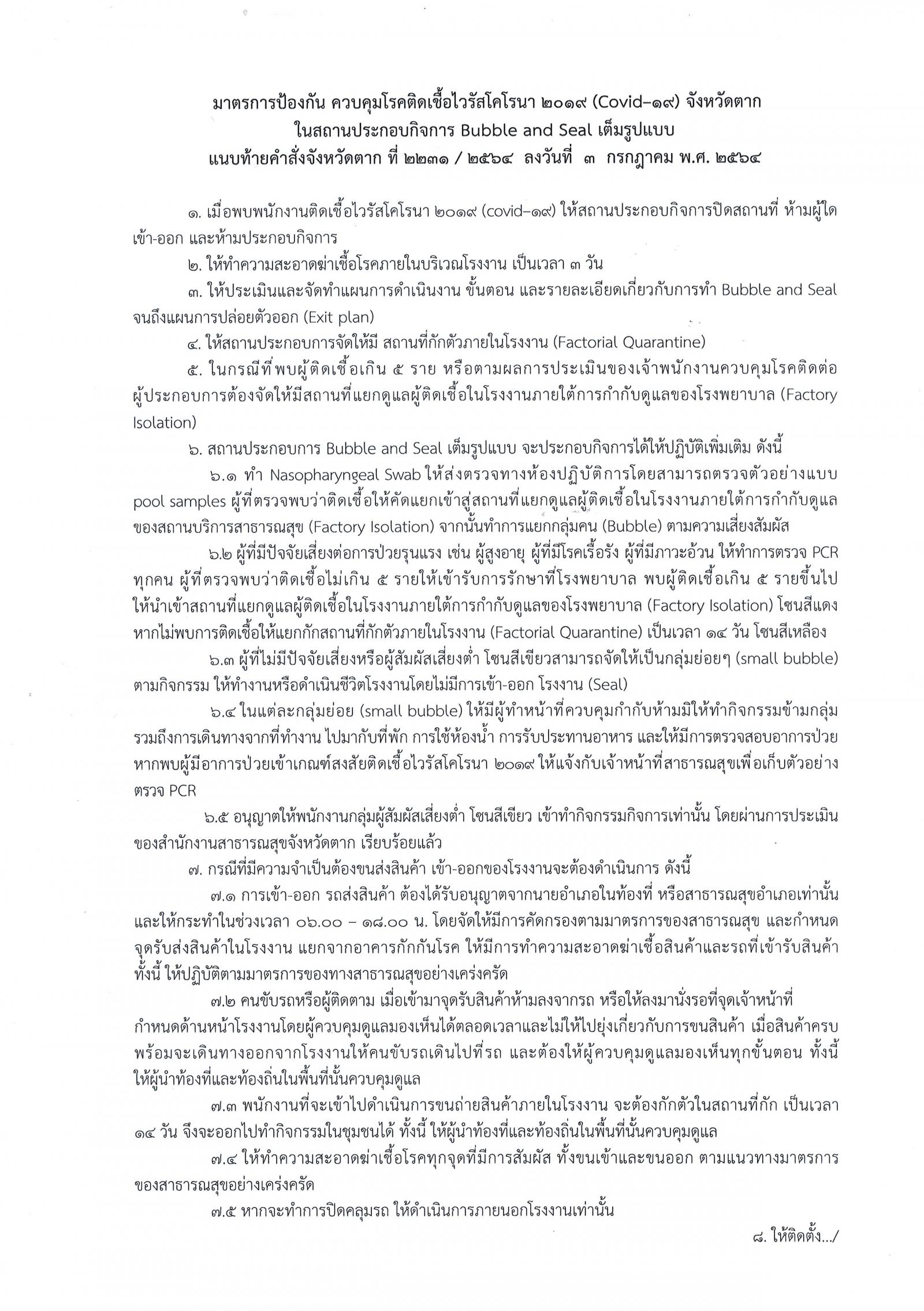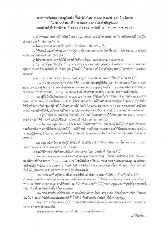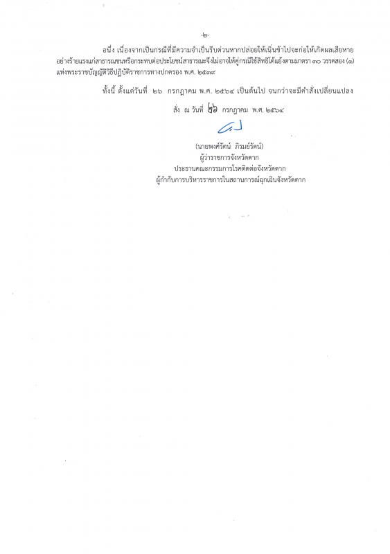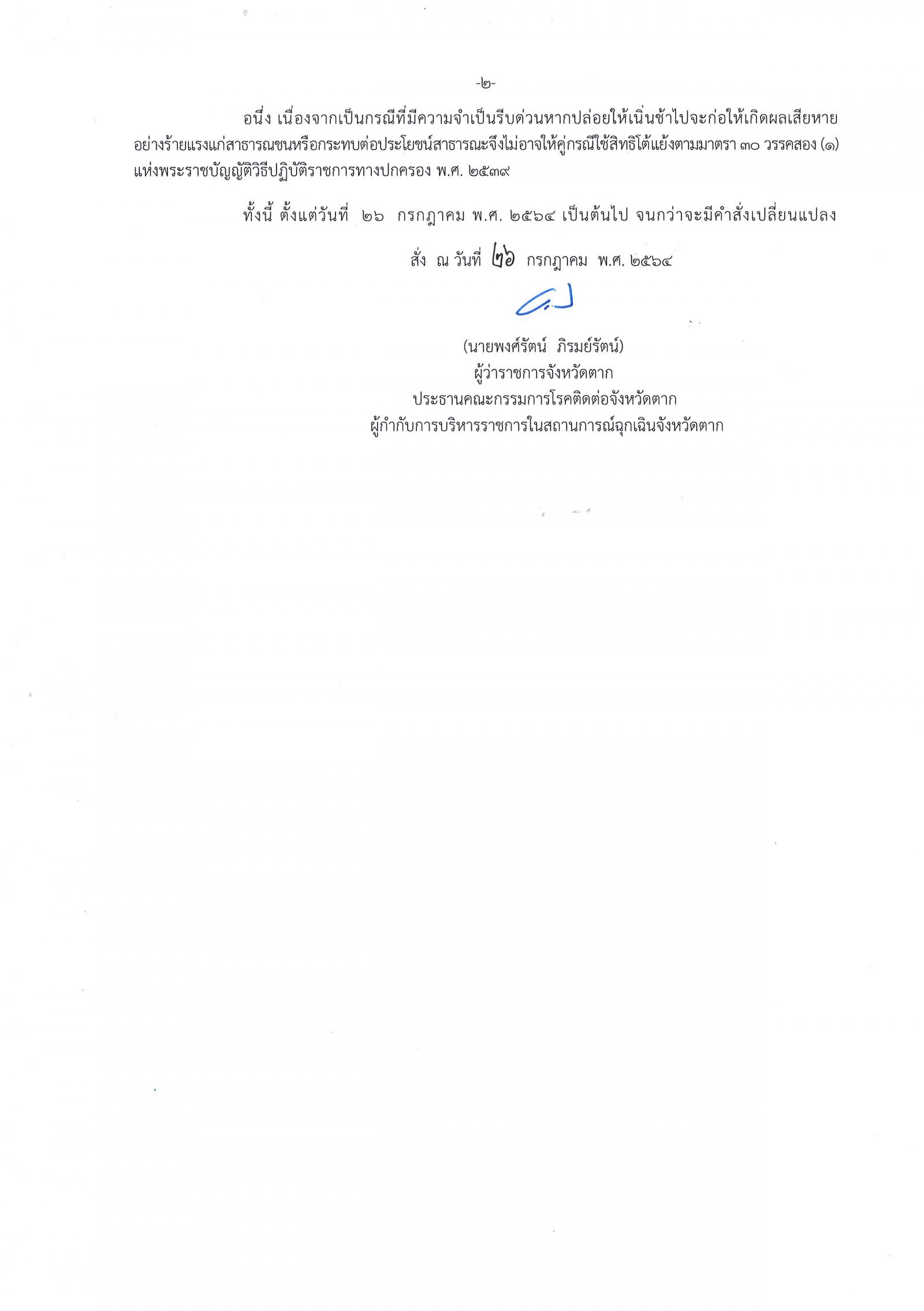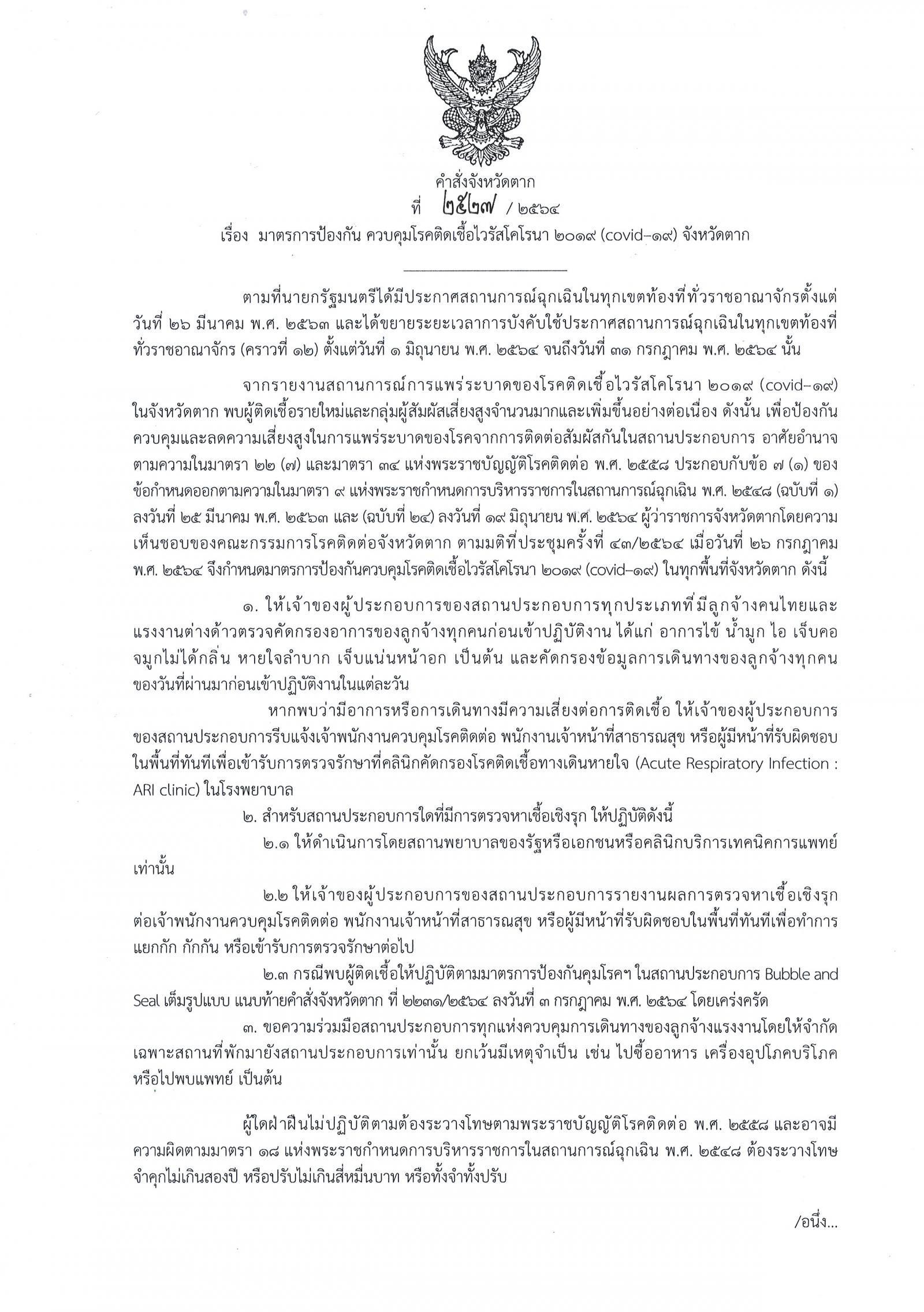 คำสั่งจังหวัดตาก ที่ 2527/2564 เรื่อง มาตรการป้องกัน ควบคุมโรคติดเชื้อไวรัสโคโรนา 2019 (โควิด-19) จังหวัดตาก