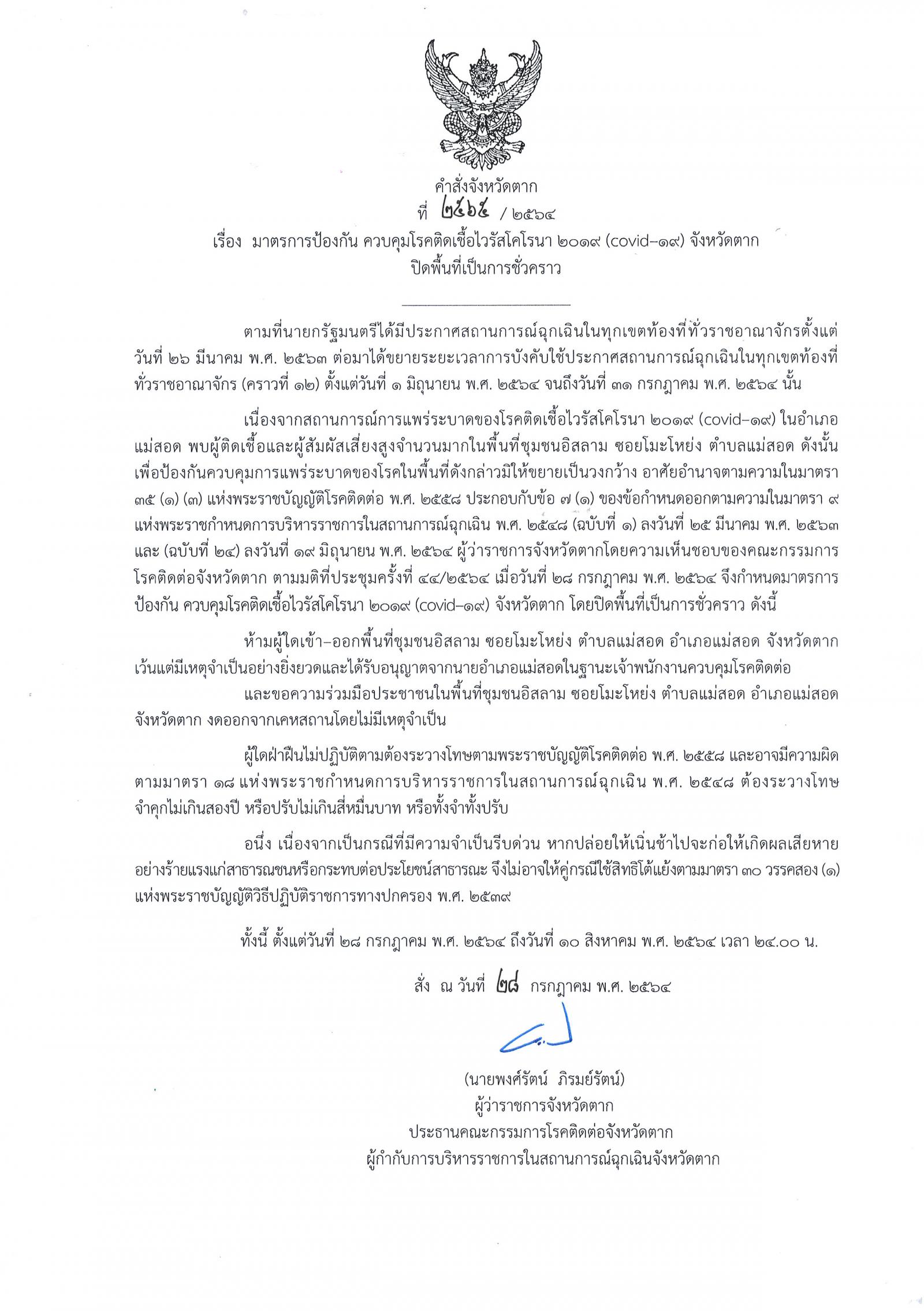 คำสั่งจังหวัดตาก ที่ 2565/2564 เรื่อง มาตรการป้องกัน ควบคุมโรคติดเชื้อไวรัสโคโรนา 2019 (โควิด-19) จังหวัดตาก ปิดพื้นที่เป็นการชั่วคราว