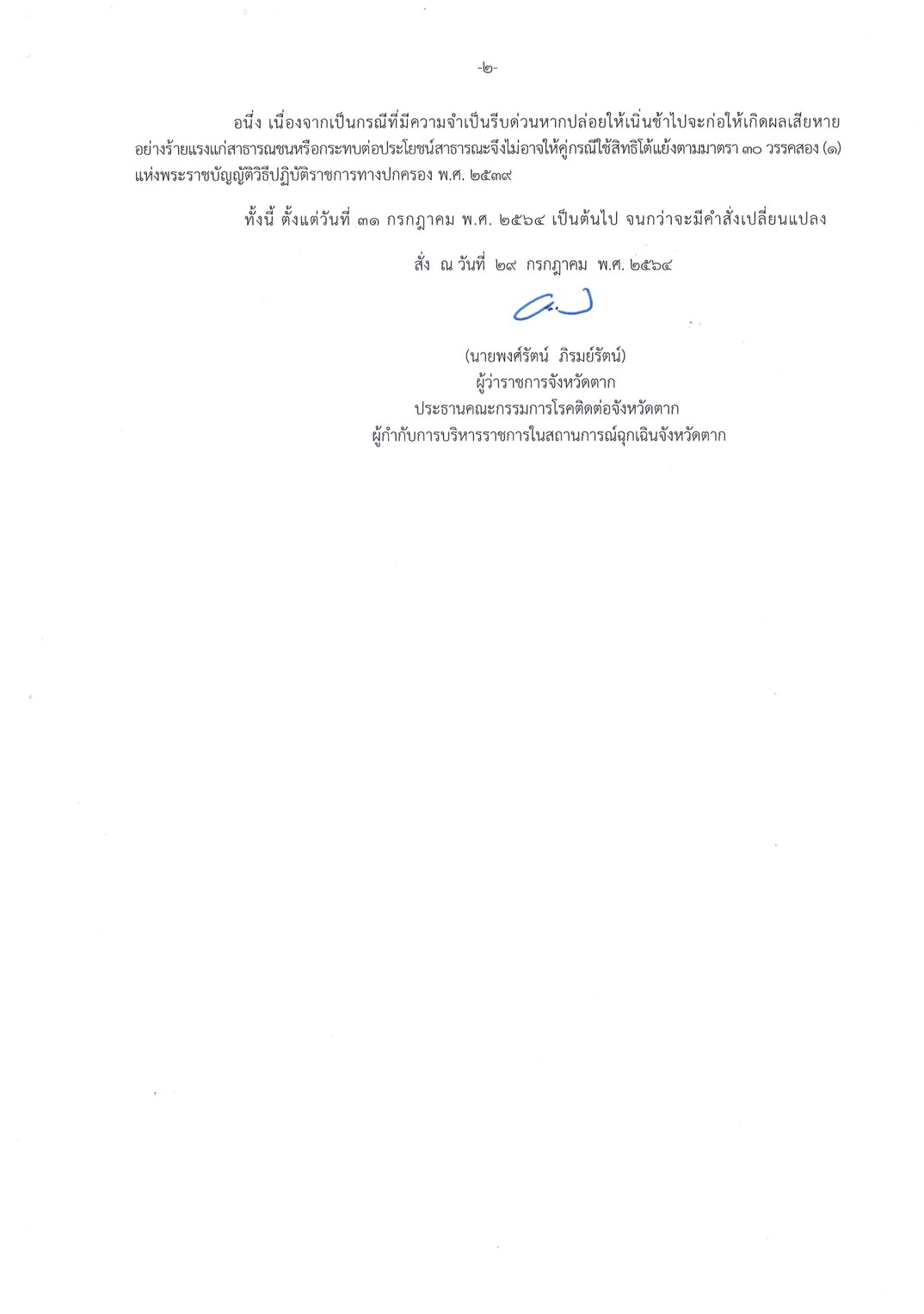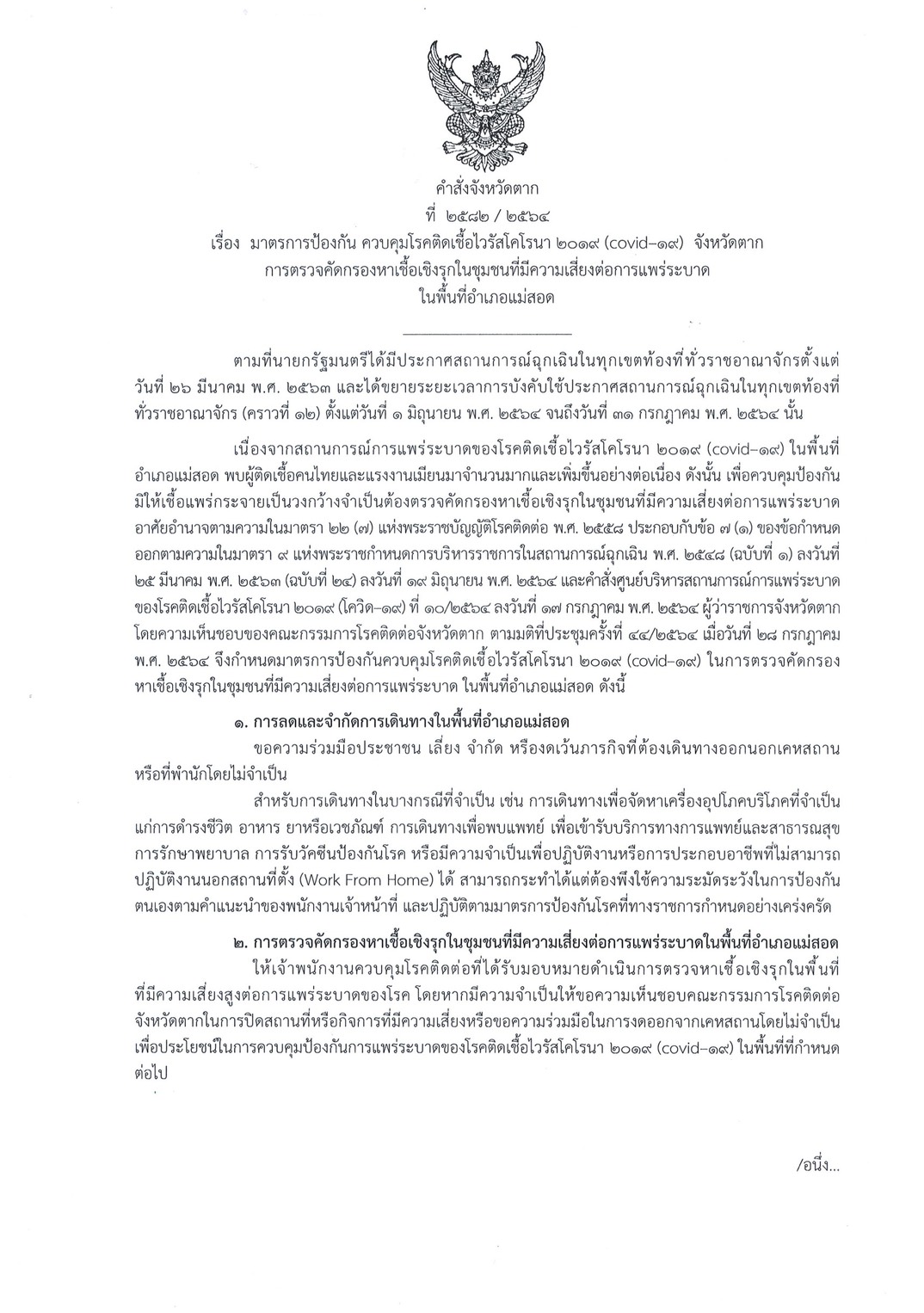 คำสั่งจังหวัดตาก ที่ 2582/2564 เรื่อง มาตรการป้องกัน ควบคุมโรคติดเชื้อไวรัสโคโรนา 2019 (โควิด-19) จังหวัดตาก การตรวจคัดกรองหาเชื้อเชิงรุกในชุมชนที่มีความเสี่ยงต่อการแพร่ระบาดในพื้นที่แม่สอด