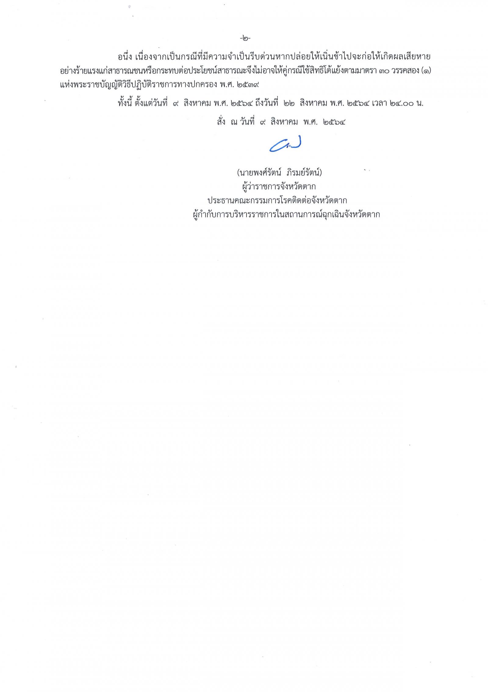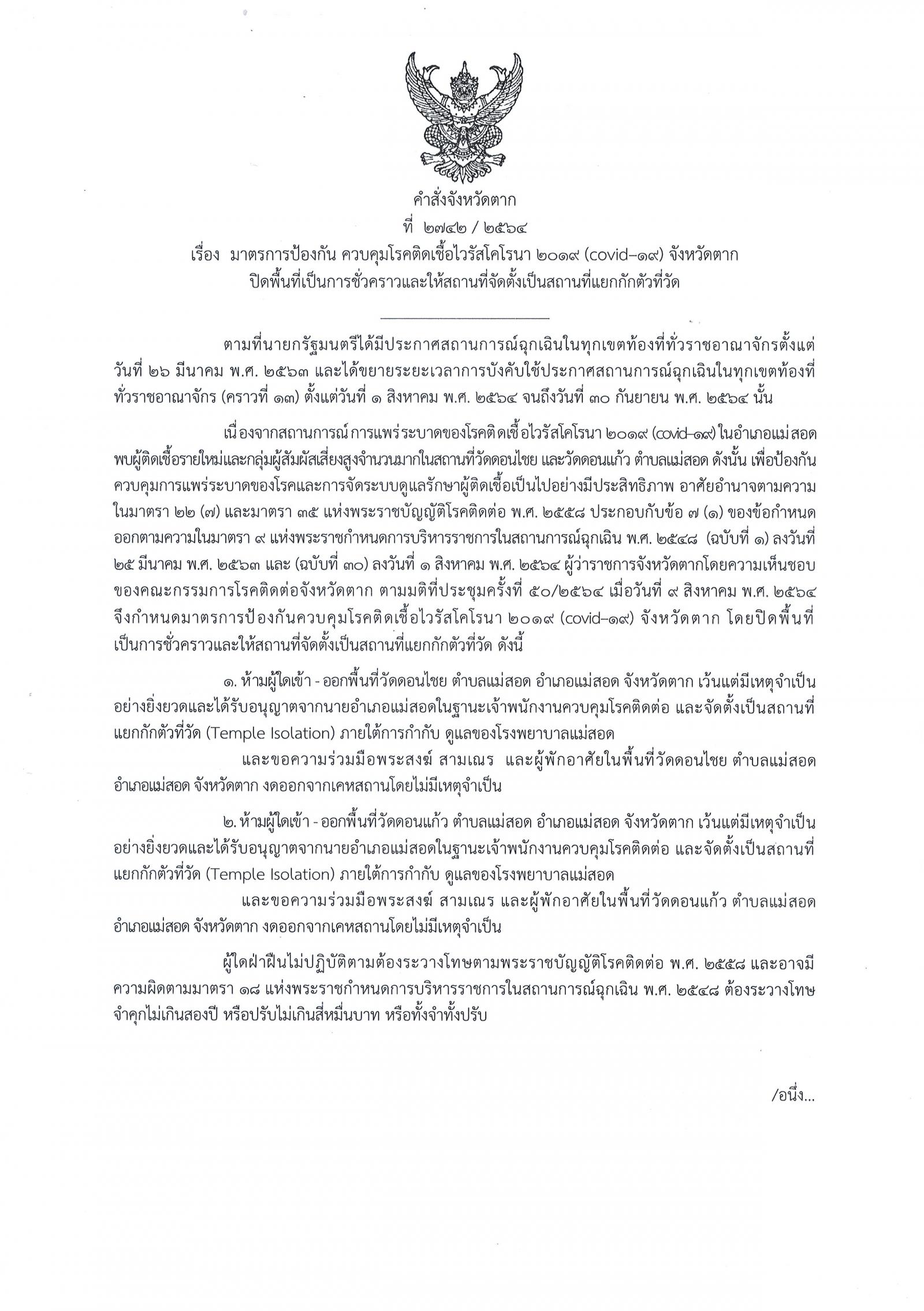 คำสั่งจังหวัดตาก ที่ 2742/2564 เรื่อง มาตรการป้องกัน ควบคุมโรคติดเชื้อไวรัสโคโรนา 2019 (โควิด-19) จังหวัดตาก ปิดสถานที่เป็นการชั่วคราวและให้สถานที่จัดตั้งเป็นสถานที่แยกกักตัวที่วัด