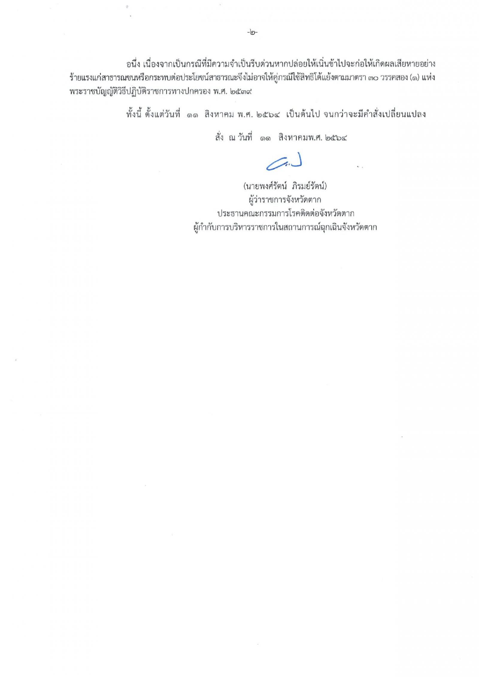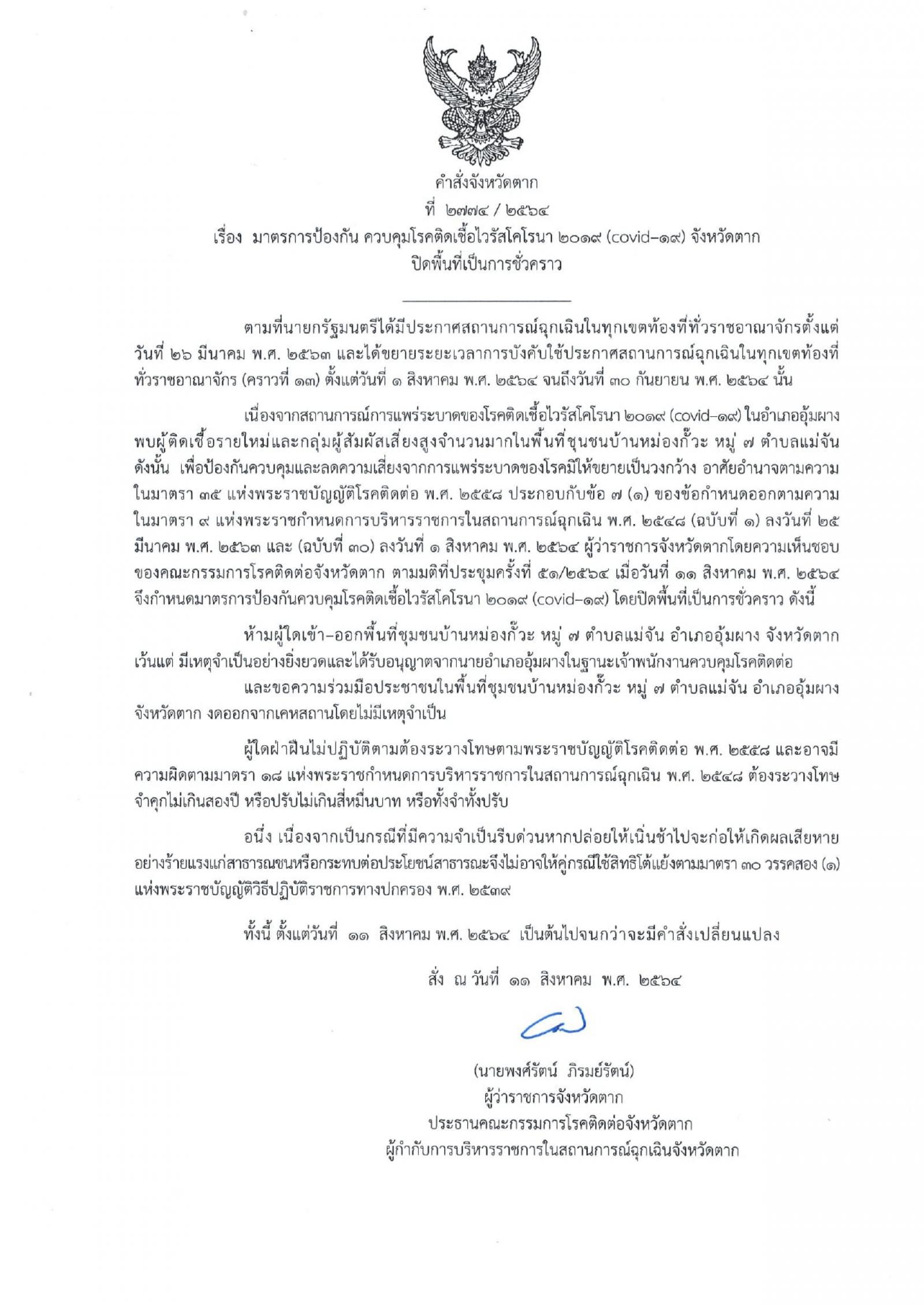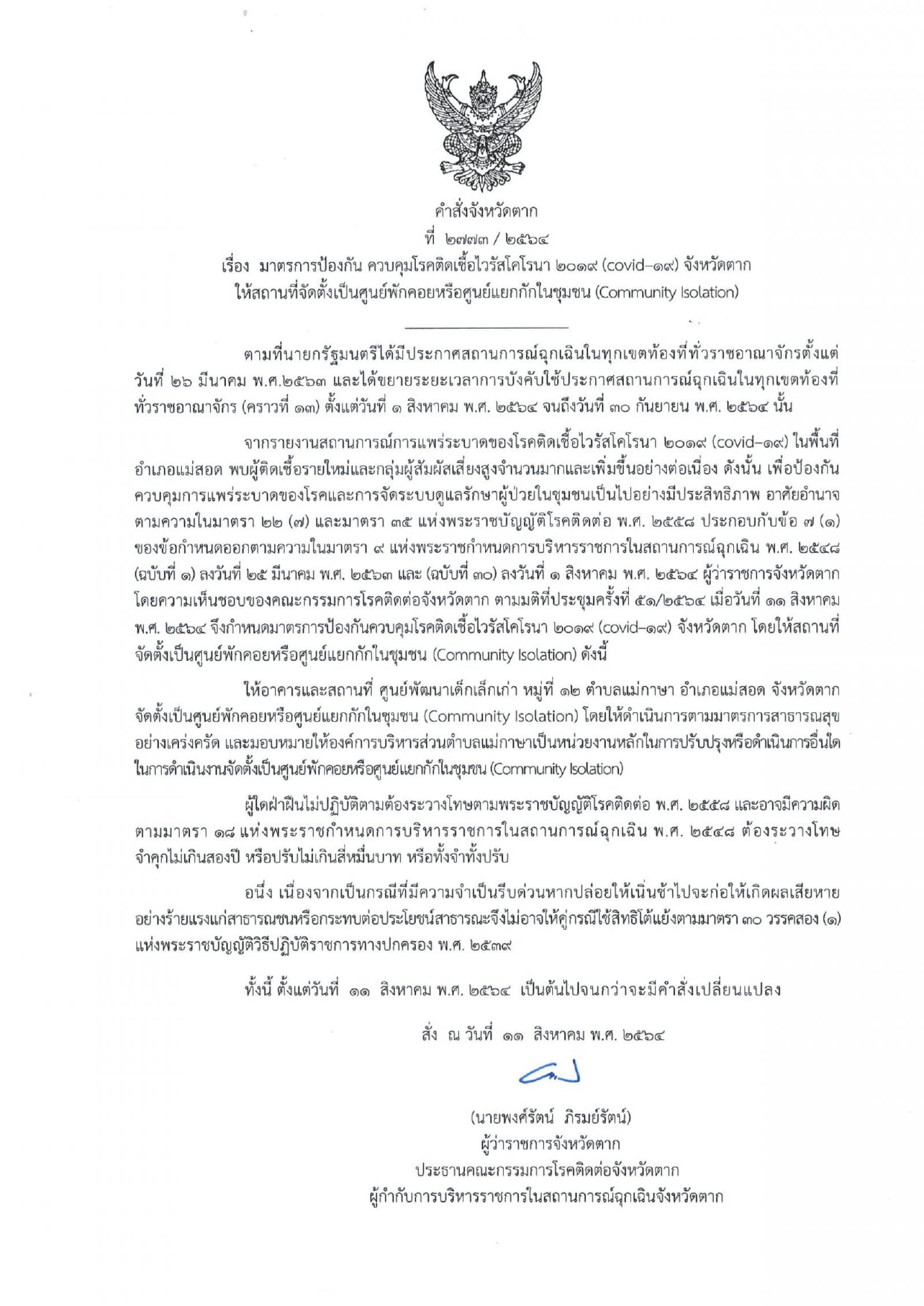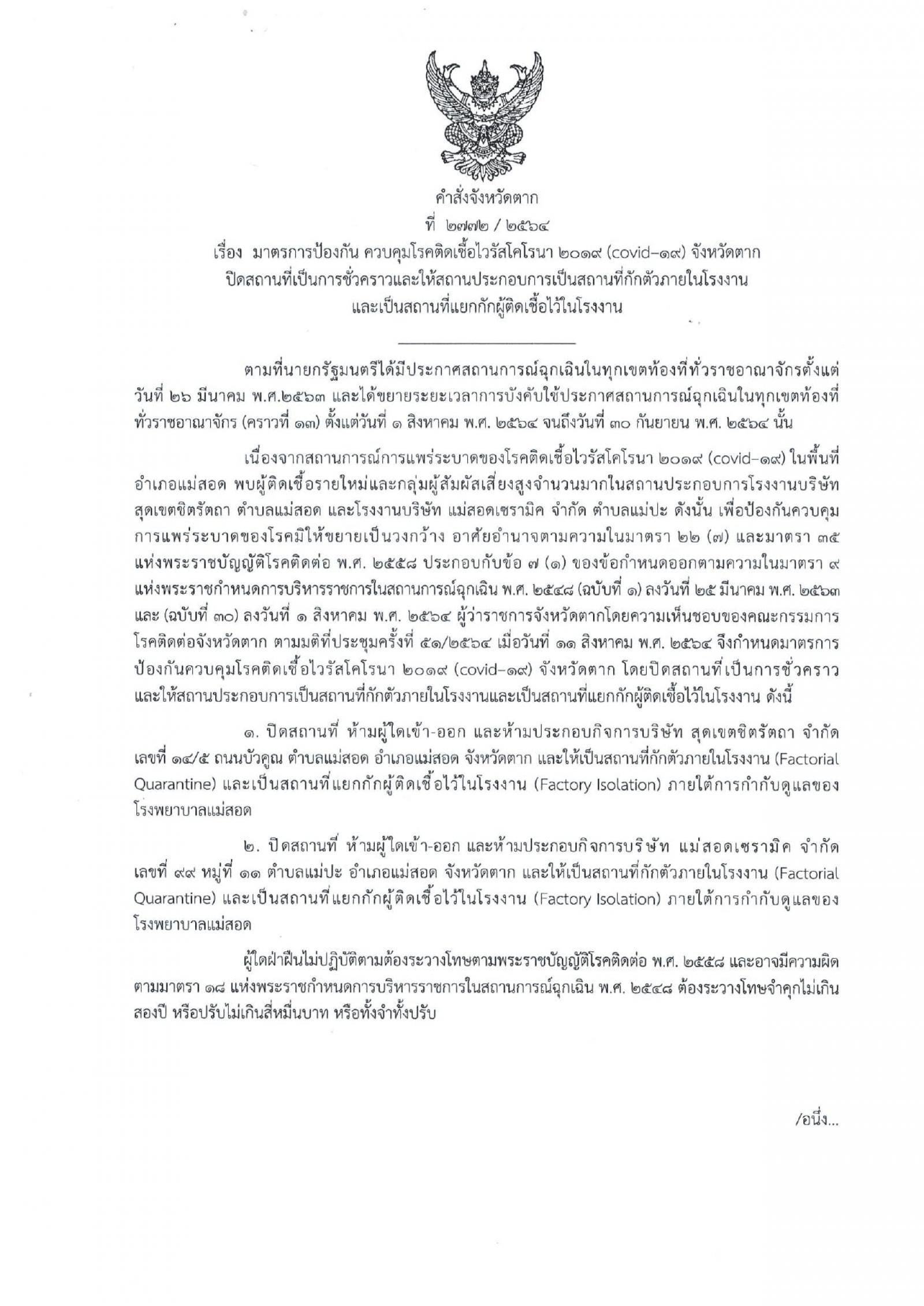 คำสั่งโควิด -19 จ.ตาก ที่ 2772 / 2564