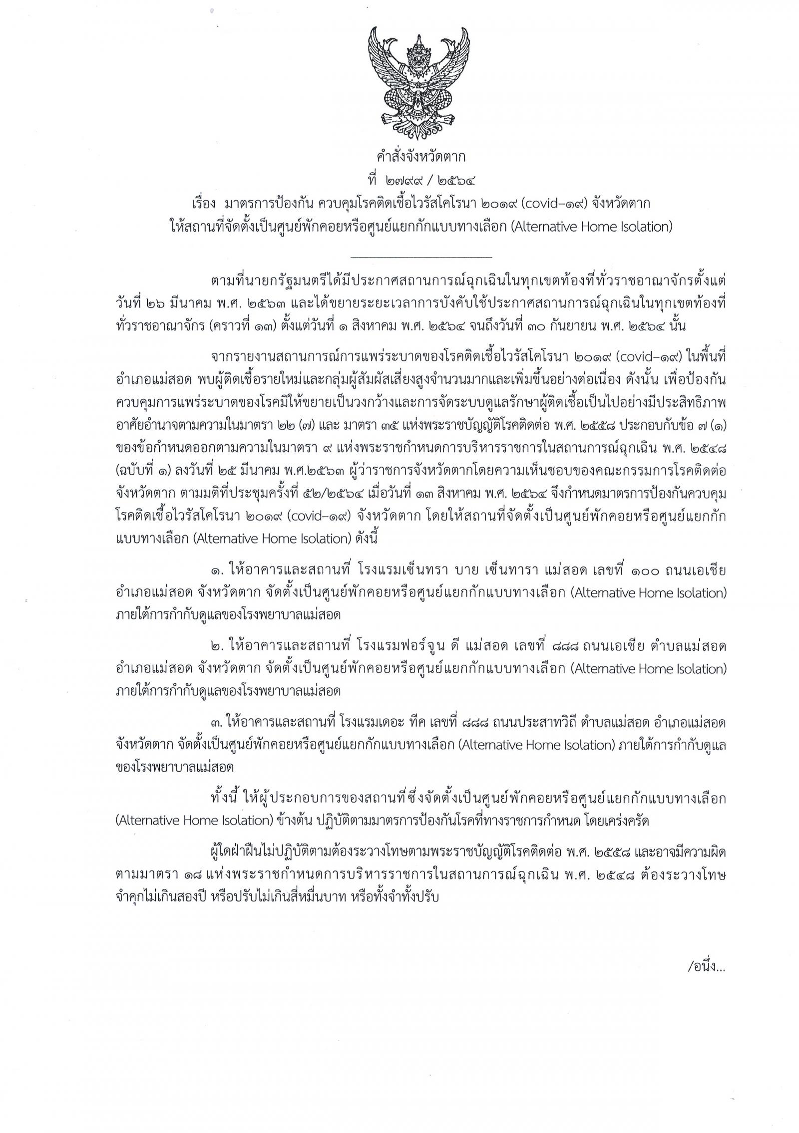 คำสั่งจังหวัดตาก ที่ 2799/2564 เรื่อง มาตรการป้องกัน ควบคุมโรคติดเชื้อไวรัสโคโรนา 2019 (โควิด-19) จังหวัดตาก ให้สถานที่จัดตั้งเป็นศูนย์พักค่อยหรือศูนย์แยกกักแบบทางเลือก (Alternative Home Lsolation)