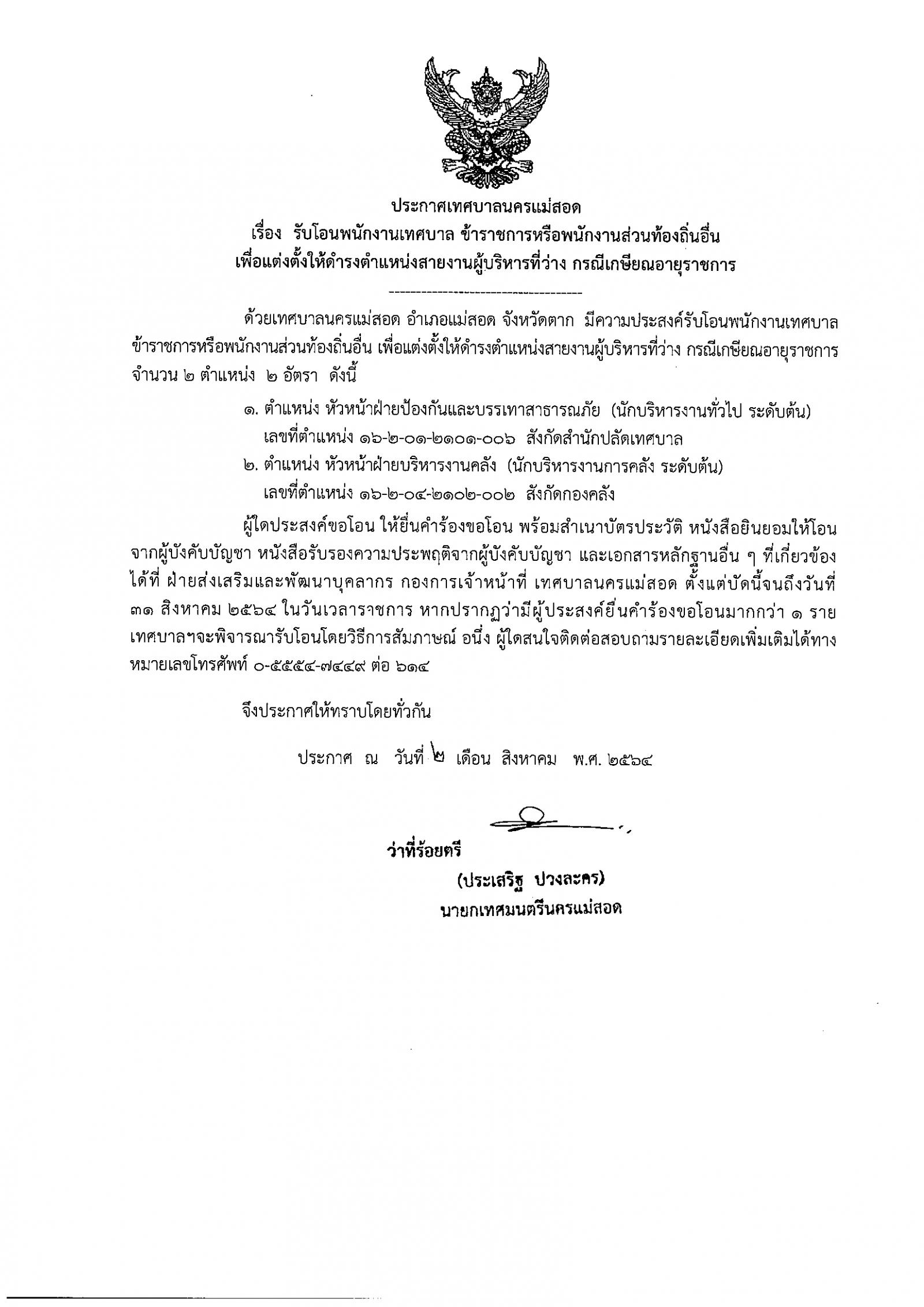 ประกาศเทศบาลนครแม่สอด เรื่อง รับโอนพนักงานเทศบาล ข้าราชการหรือพนักงานส่วนท้องถิ่นอื่น เพื่อแต่งตั้งให้ดำรงตำแหน่งสายงานผู้บริหารที่ว่าง กรณีเกษียณอายุราชการ