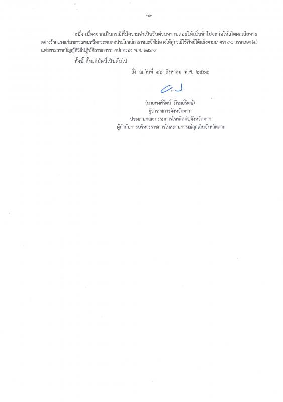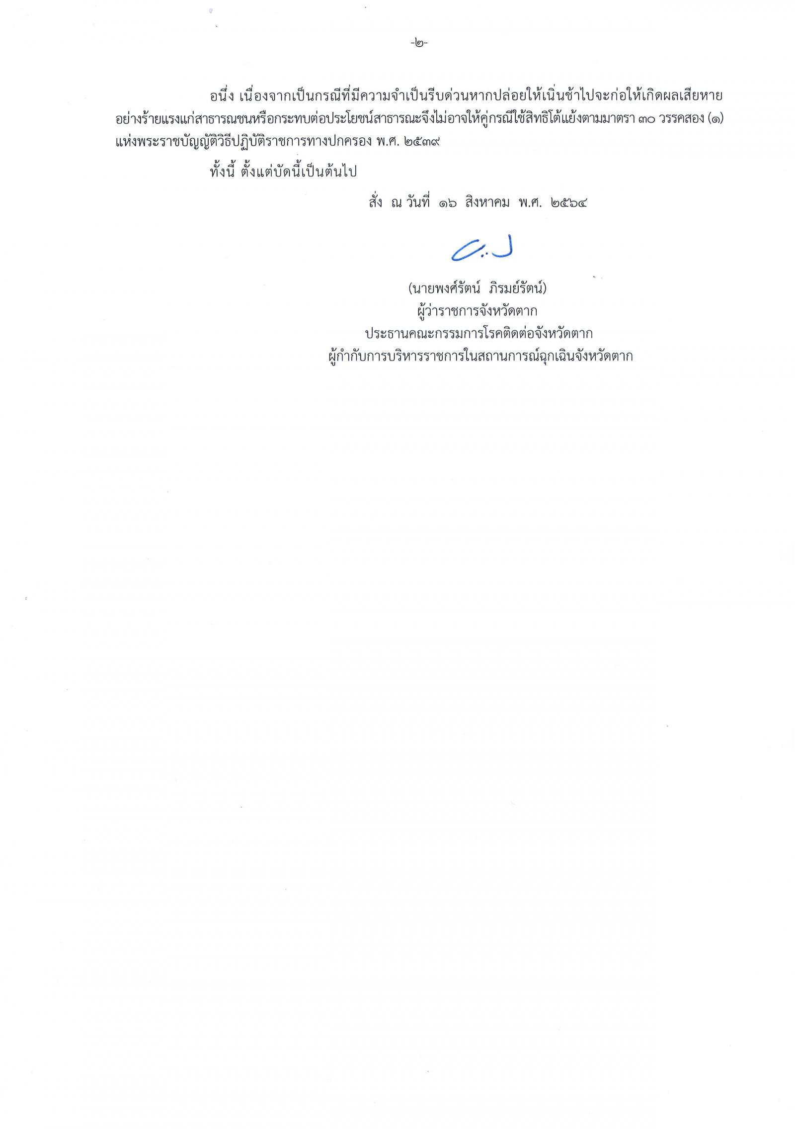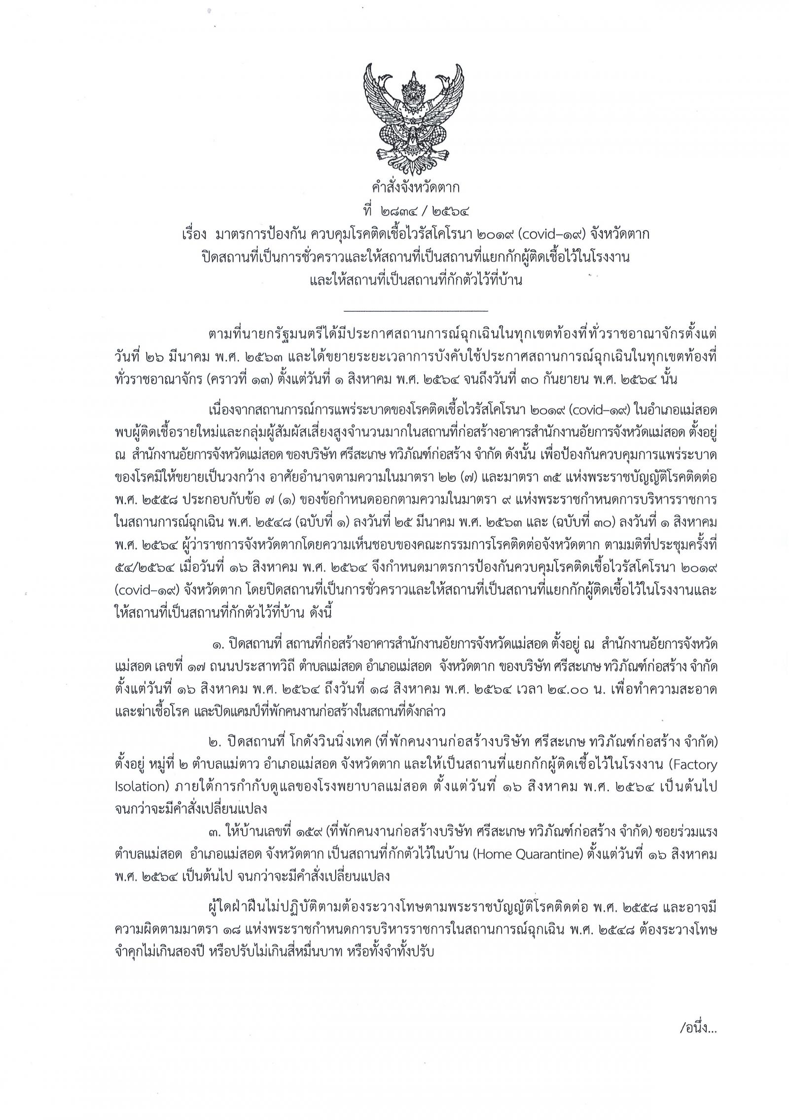 คำสั่งจังหวัดตาก ที่ 2834/2564 เรื่อง มาตรการป้องกัน ควบคุมโรคติดเชื้อไวรัสโคโรนา 2019 (โควิด-19) จังหวัดตาก ปิดสถานที่เป็นการชั่วคราวและให้สถานที่เป็นสถานที่แยกกักผู้ติดเชื้อไว้ในโรงงานและให้สถานที่เป็นสถานที่กักตัวไว้ที่บ้าน