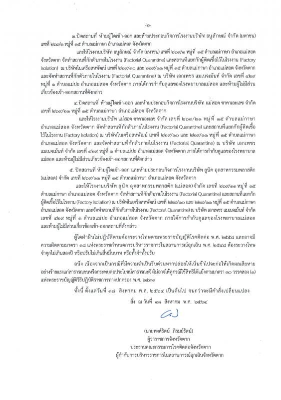 คำสั่งจังหวัดตาก ที่ 2879/2564 เรื่อง มาตรการป้องกันควบคุมโรคติดเชื้อไวรัสโคโรนา 2019 (โควิด–19) จังหวัดตาก ปิดสถานที่เป็นการชั่วคราวและให้สถานประกอบการเป็นสถานที่กักตัวภายในโรงงานและเป็นสถานที่แยกกักผู้ติดเชื้อไว้ในโรงงาน
