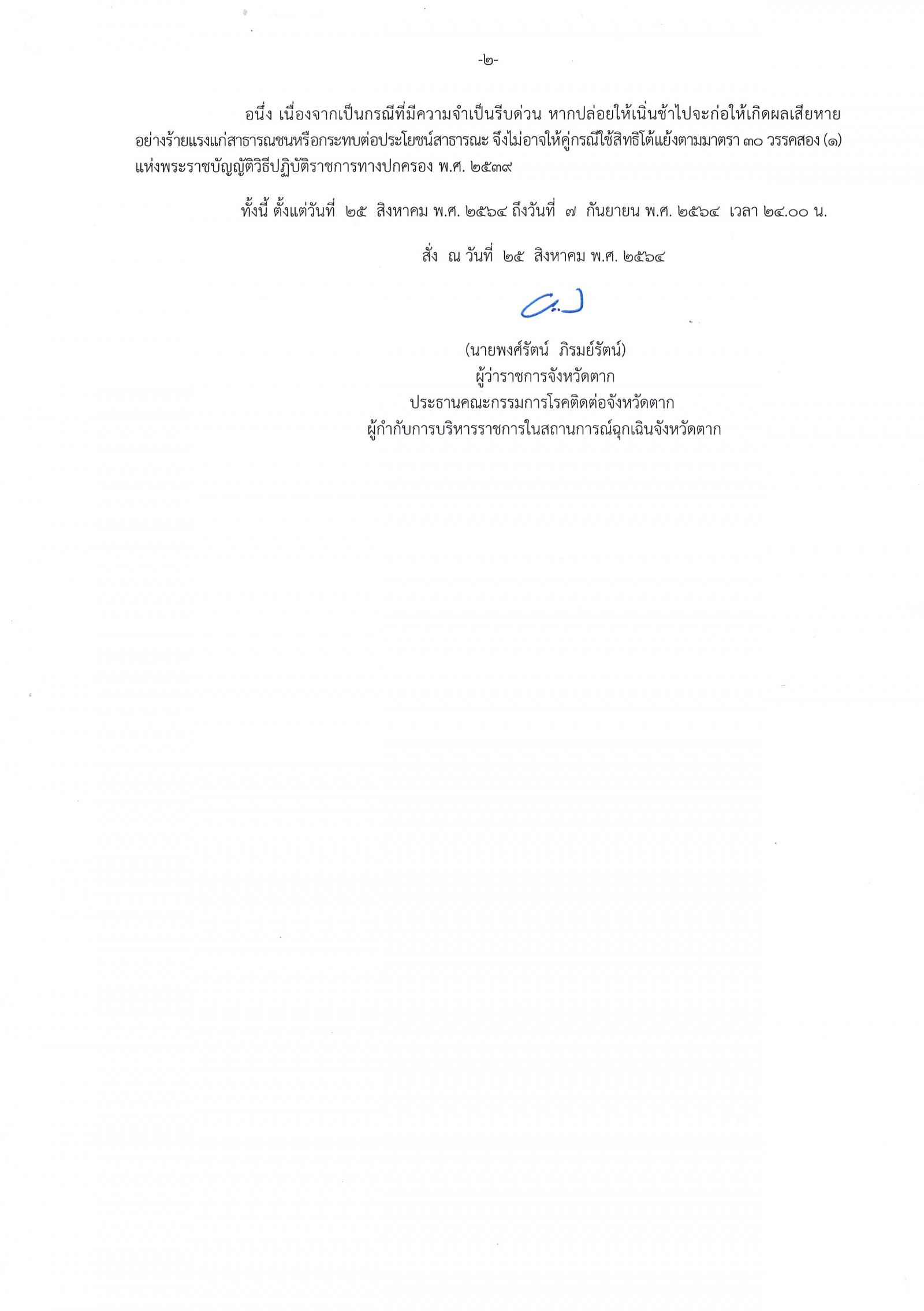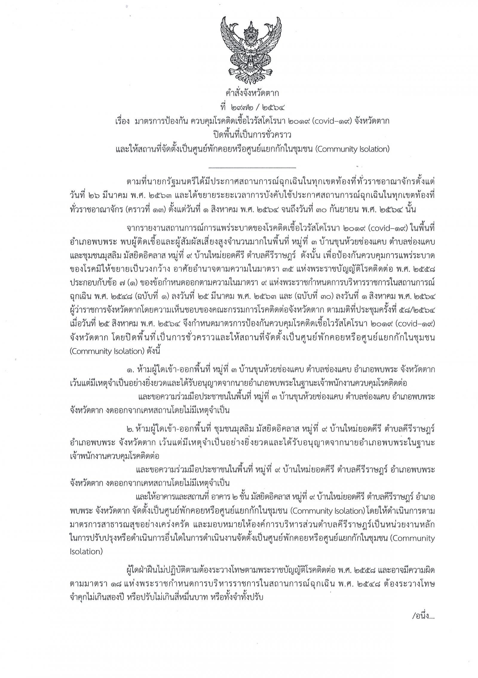 คำสั่งจังหวัดตาก ที่ 2972/2564 เรื่อง มาตรการป้องกัน ควบคุมโรคติดเชื้อไวรัสโคโรนา 2019 (โควิด-19) จังหวัดตาก ปิดพื้นที่เป็นการชั่วคราวและให้สถานที่จัดตั้งเป็นศูนย์พักคอยหรือศูนย์แยกกักในชุมชน