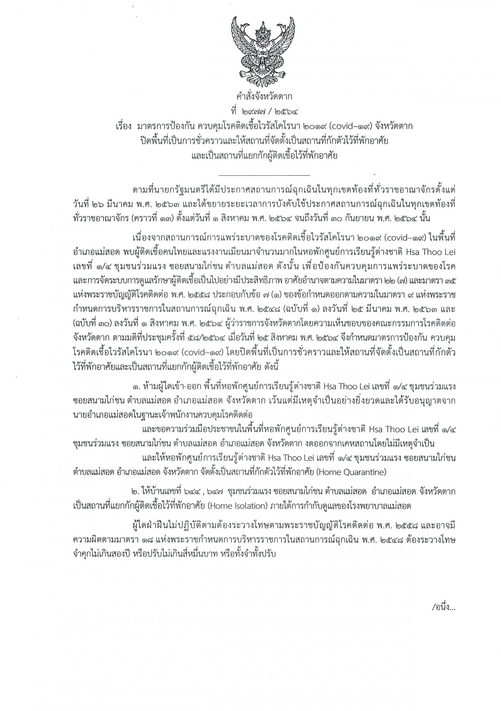คำสั่งจังหวัดตาก ที่ 2977/2564 เรื่อง มาตรการป้องกัน ควบคุมโรคติดเชื้อไวรัสโคโรนา 2019 (โควิด-19) จังหวัดตาก ปิดพื้นที่เป็นการชั่วคราวและให้สถานที่จัดตั้งเป็นสถานที่กักตัวไว้ในที่พักอาศัยและเป็นสถานที่แยกกักตัวผู้ติดเชื้อไว้ที่พักอาศัย