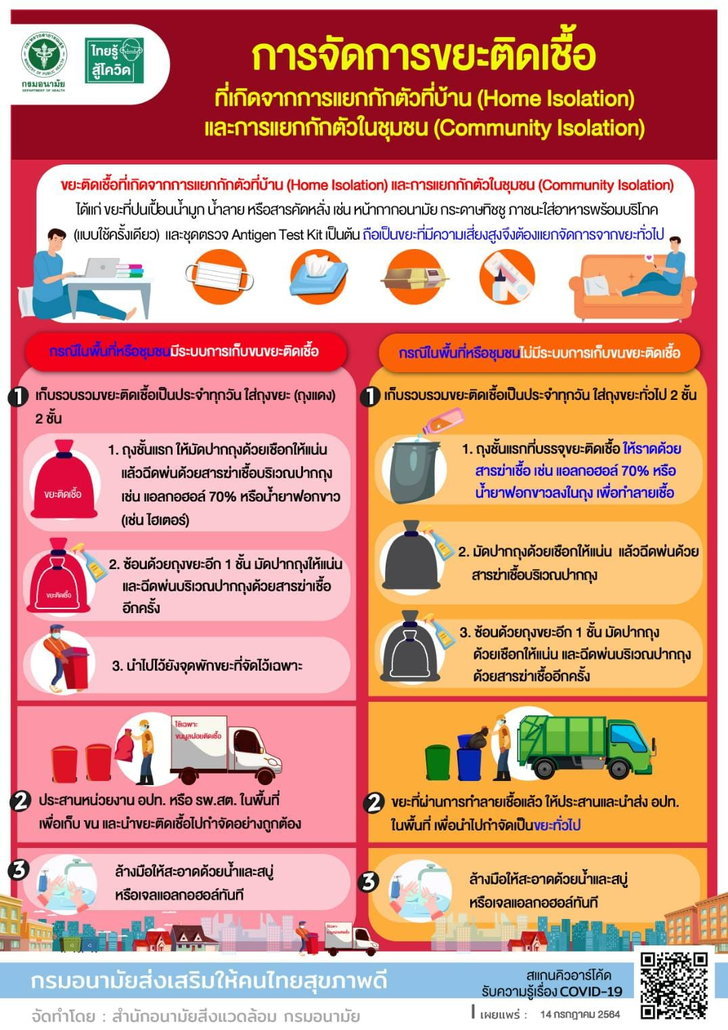 1. การทิ้งขยะมูลฝอยติดเชื้อชุมชน สำหรับประชาชนที่แยกกักตัวที่บ้าน (Home Isolation) เช่น หน้ากากอนามัย หน้ากากผ้า ชุดตรวจ Antigen Test Kit ขยะที่ปนเปื้อนน้ำมูก น้ำลาย หรือสารคัดหลั่ง ให้ปฏิบัติ ดังนี้