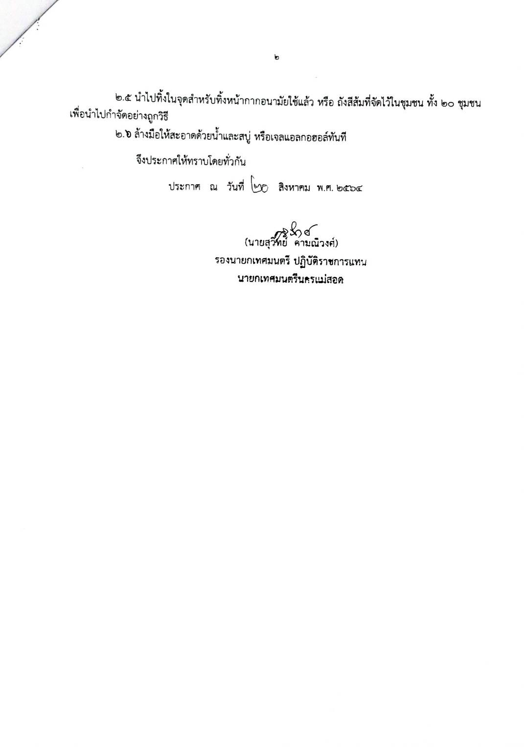 ประกาศเทศบาลนครแม่สอด เรื่อง มาตรการจัดการขยะในช่วงสถานการณ์ระบาดของโรคติดเชื้อไวรัสโคโรนา 2019 (COVID-19)