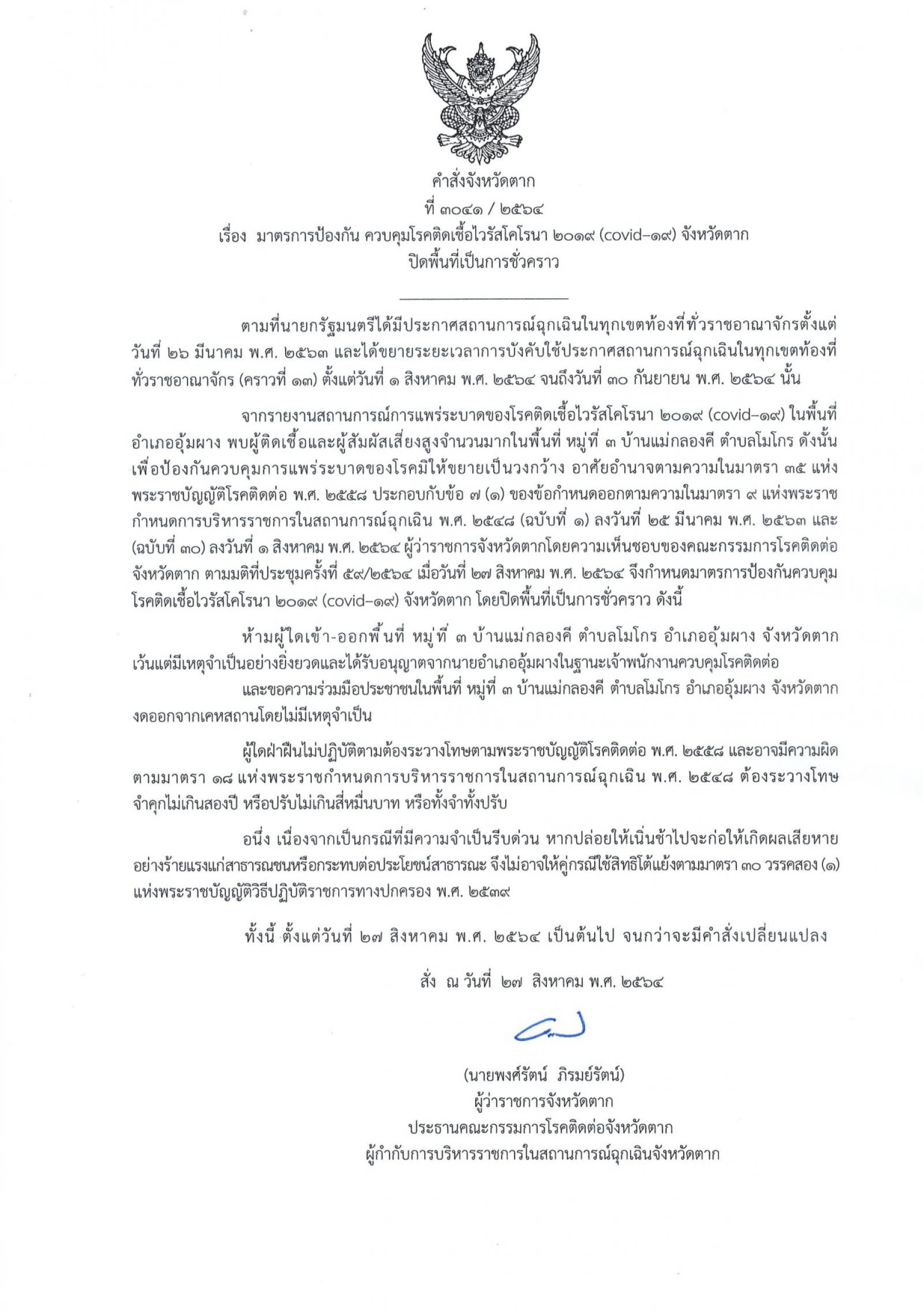 คำสั่งจังหวัดตาก ที่ 3041/2564 เรื่อง มาตรการป้องกัน ควบคุมโรคติดเชื้อไวรัสโคโรนา 2019 (โควิด-19) จังหวัดตาก ปิดพื้นที่เป็นการชั่วคราว