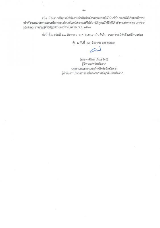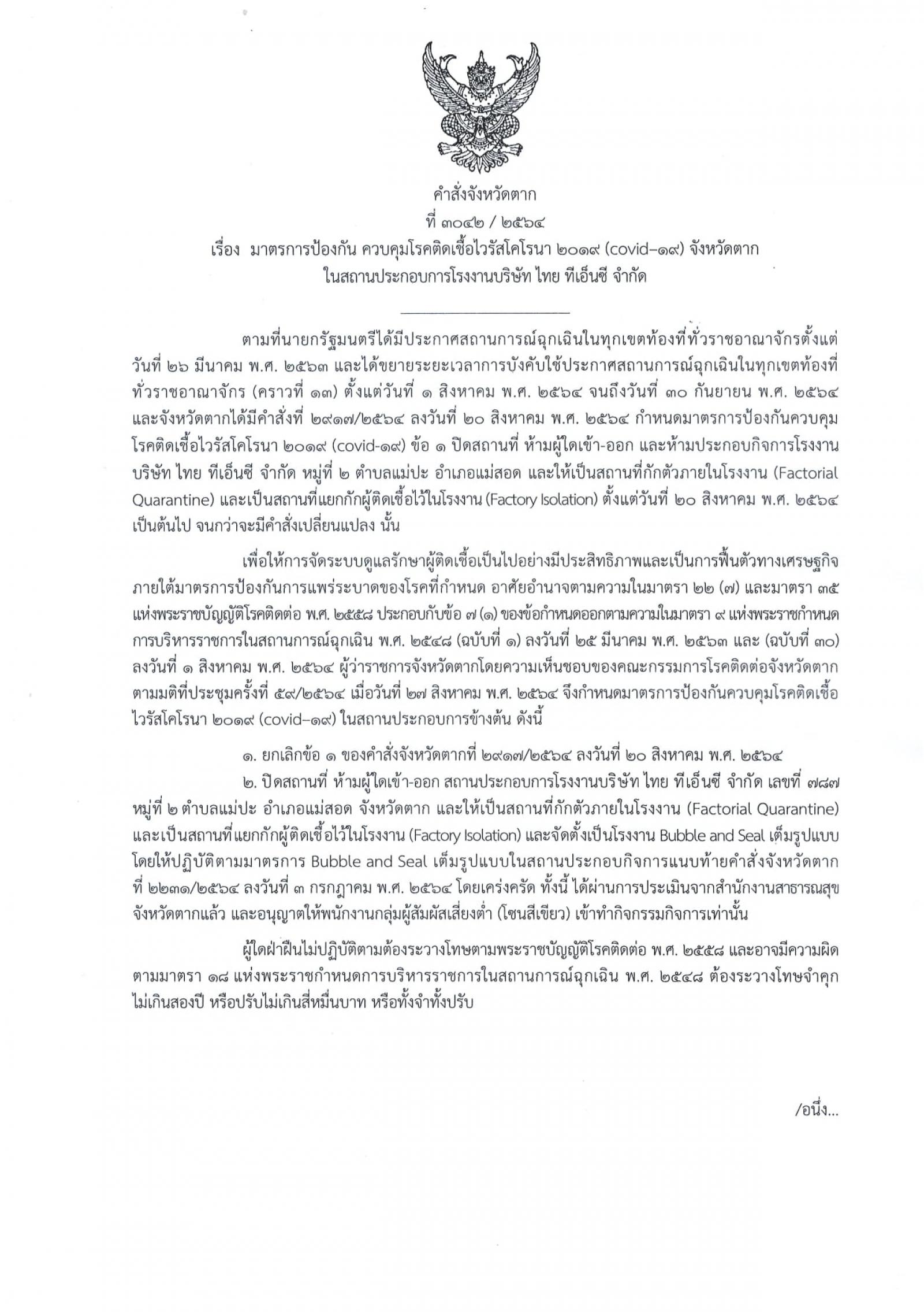 คำสั่งจังหวัดตาก ที่ 3042/2564 เรื่อง มาตรการป้องกัน ควบคุมโรคติดเชื้อไวรัสโคโรนา 2019 (โควิด-19) จังหวัดตาก ในสถานประกอบการโรงงานบริษัท ไทย ทีเอ็นซี จำกัด