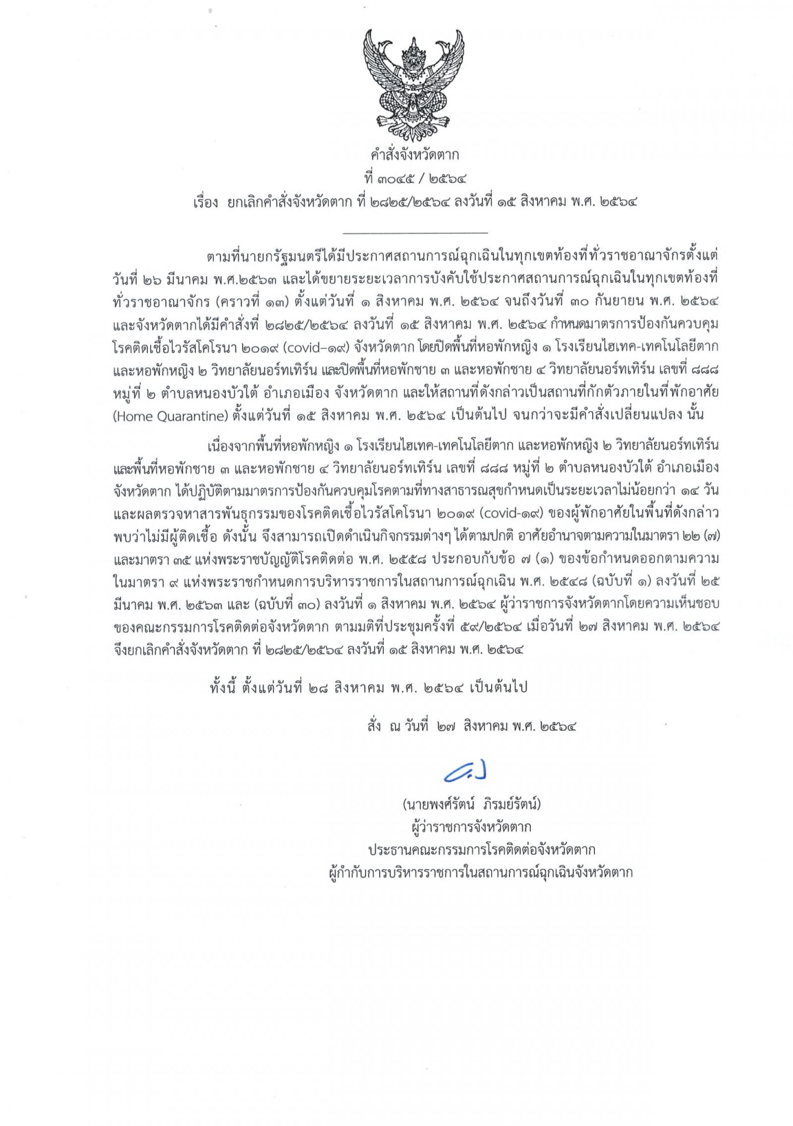 คำสั่งจังหวัดตาก ที่ 3045/2564 เรื่อง ยกเลิกคำสั่งจังหวัดตาก ที่ 2825/2564 ลงวันที่ 15 สิงหาคม 2564