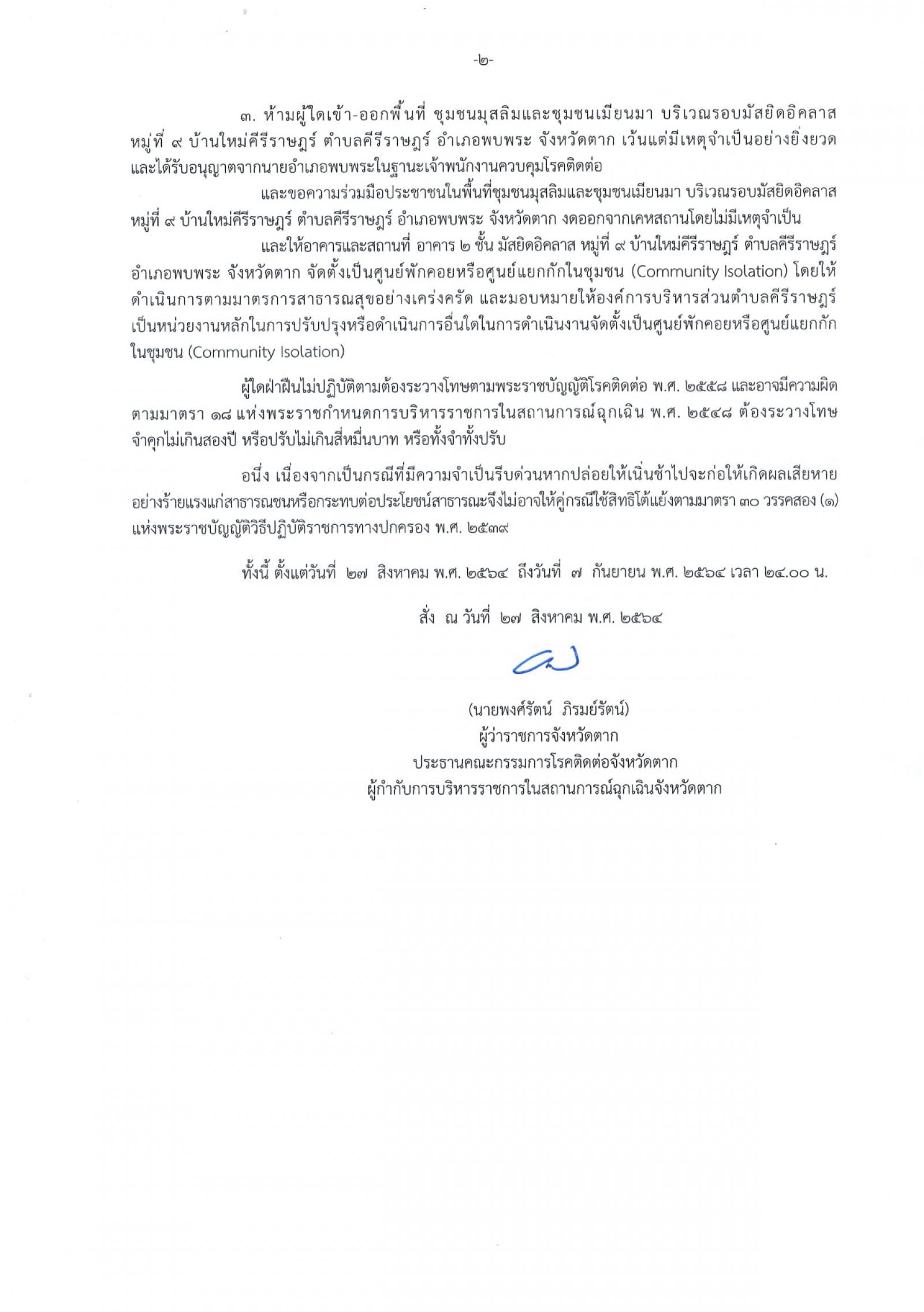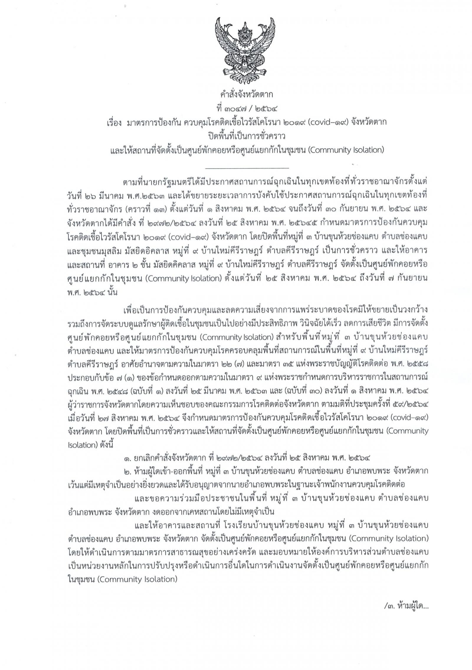 คำสั่งจังหวัดตาก ที่ 3047/2564 เรื่อง มาตรการป้องกัน ควบคุมโรคติดเชื้อไวรัสโคโรนา 2019 (โควิด-19) จังหวัดตาก ปิดพื้นที่เป็นการชั่วคราว และให้สถานที่จัดตั้งเป็นศูนย์พักคอยหรือศูนย์แยกกักในชุมชน (Community Isolation)