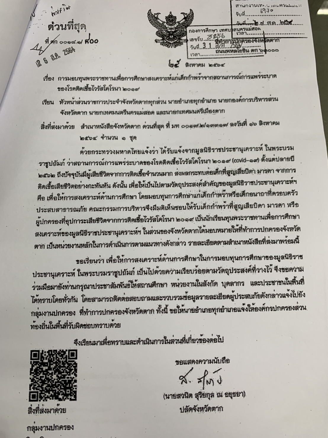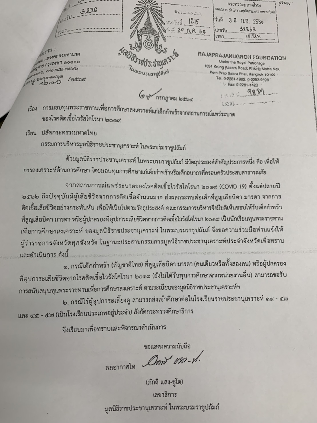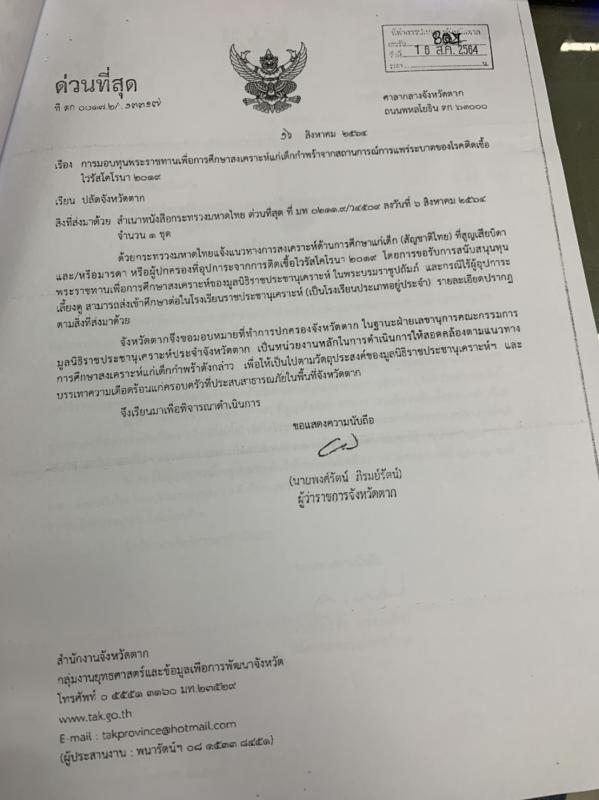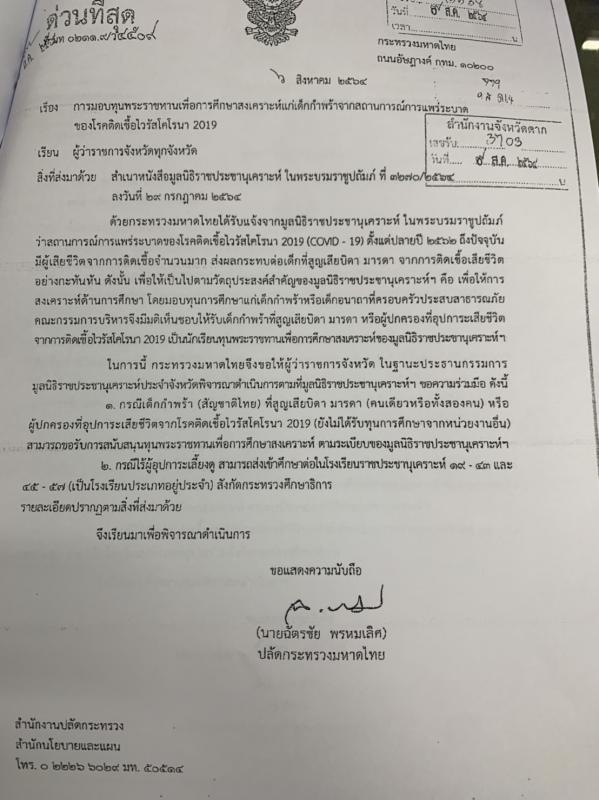 การมอบทุนพระราชทานเพื่อการศึกษาสงเคราะห์แก่เด็กกำพร้าจากสถานการณ์แพร่ระบาดของโรคติดเชื้อไวรัสโคโรนา 2019 (โควิด-19)