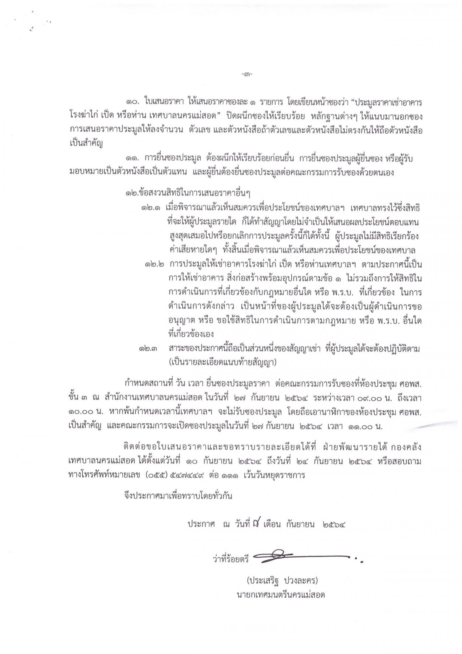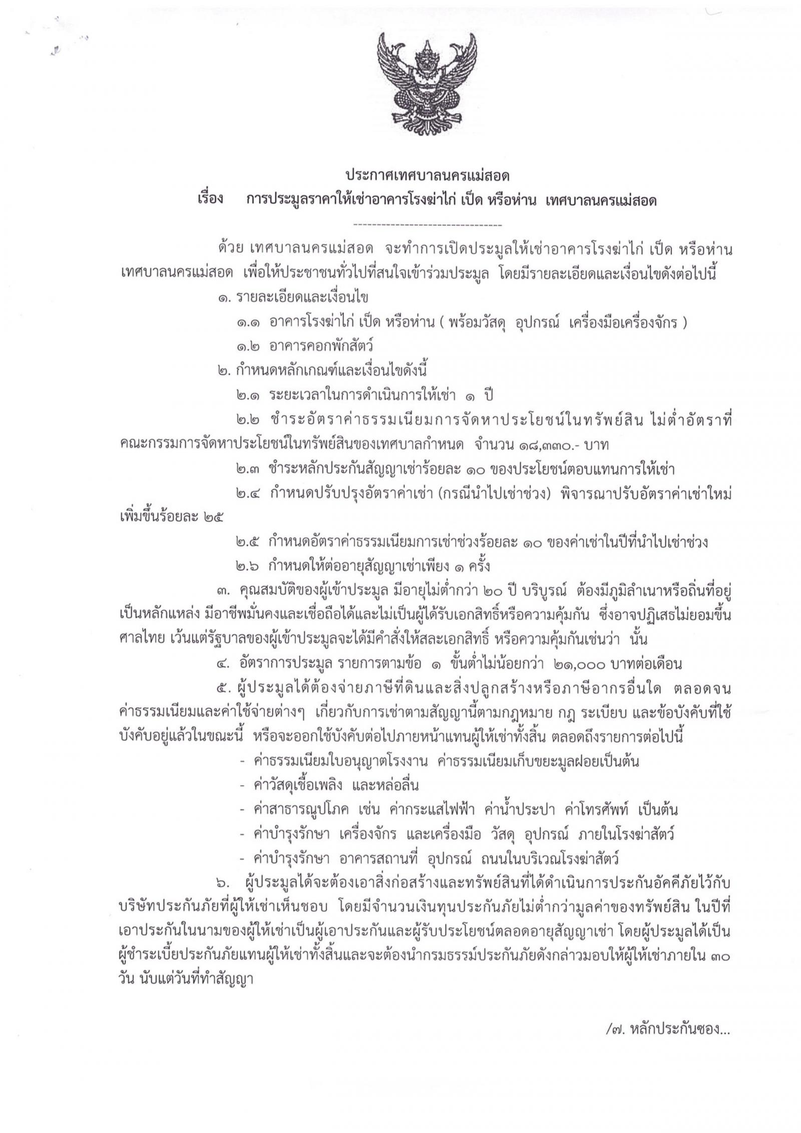 ประกาศเทศบาลนครแม่สอด เรื่อง การประมูลราคาโรงฆ่าไก่ฯ เทศบาลนครแม่สอด