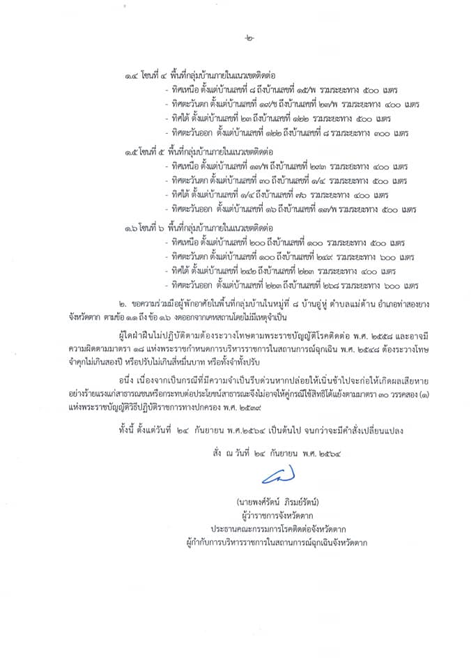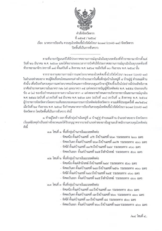 คำสั่งจังหวัดตาก ที่ 3535 / 2564 เรื่อง มาตรการป้องกัน ควบคุมโรคติดเชื้อไวรัสโคโรนา 2019 (covid–19) จังหวัดตาก ปิดพื้นที่เป็นการชั่วคราว