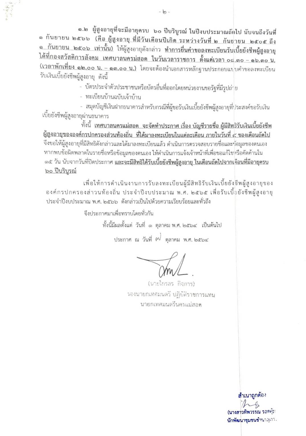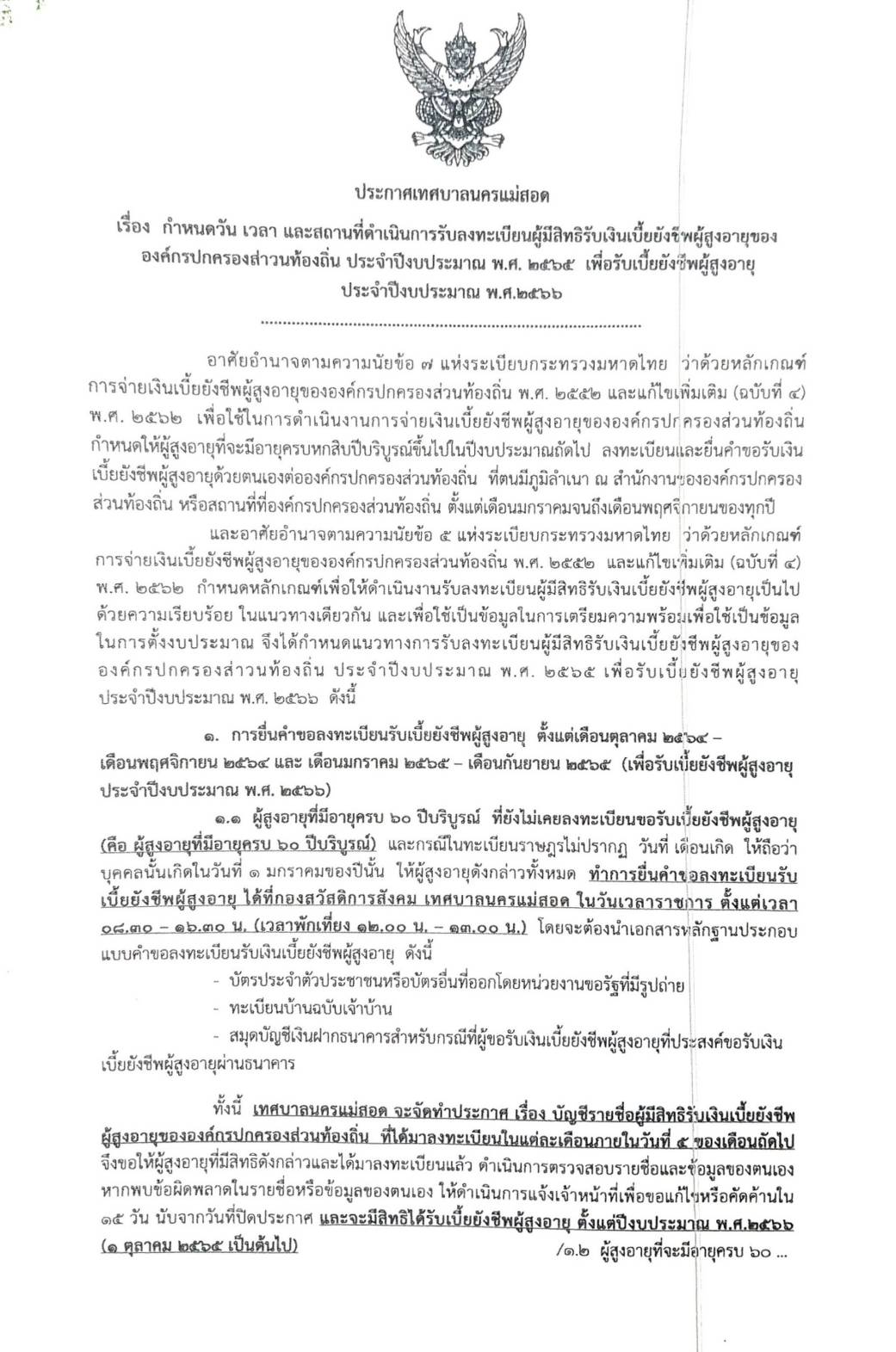 ประกาศเทศบาลนครแม่สอด เรื่อง กำหนดวัน เวลา และสถานที่ดำเนินการรับลงทะเบียนผู้มีสิทธิรับเงินเบี้ยยังชีพผู้สูงอายุ ขององค์กรปกครองส่วนท้องถิ่น ประจำปีงบประมาณ พ.ศ. 2565 เพื่อรับเบี้ยยังชีพผู้สูงอายุ ประจำปีงบประมาณ พ.ศ.2566