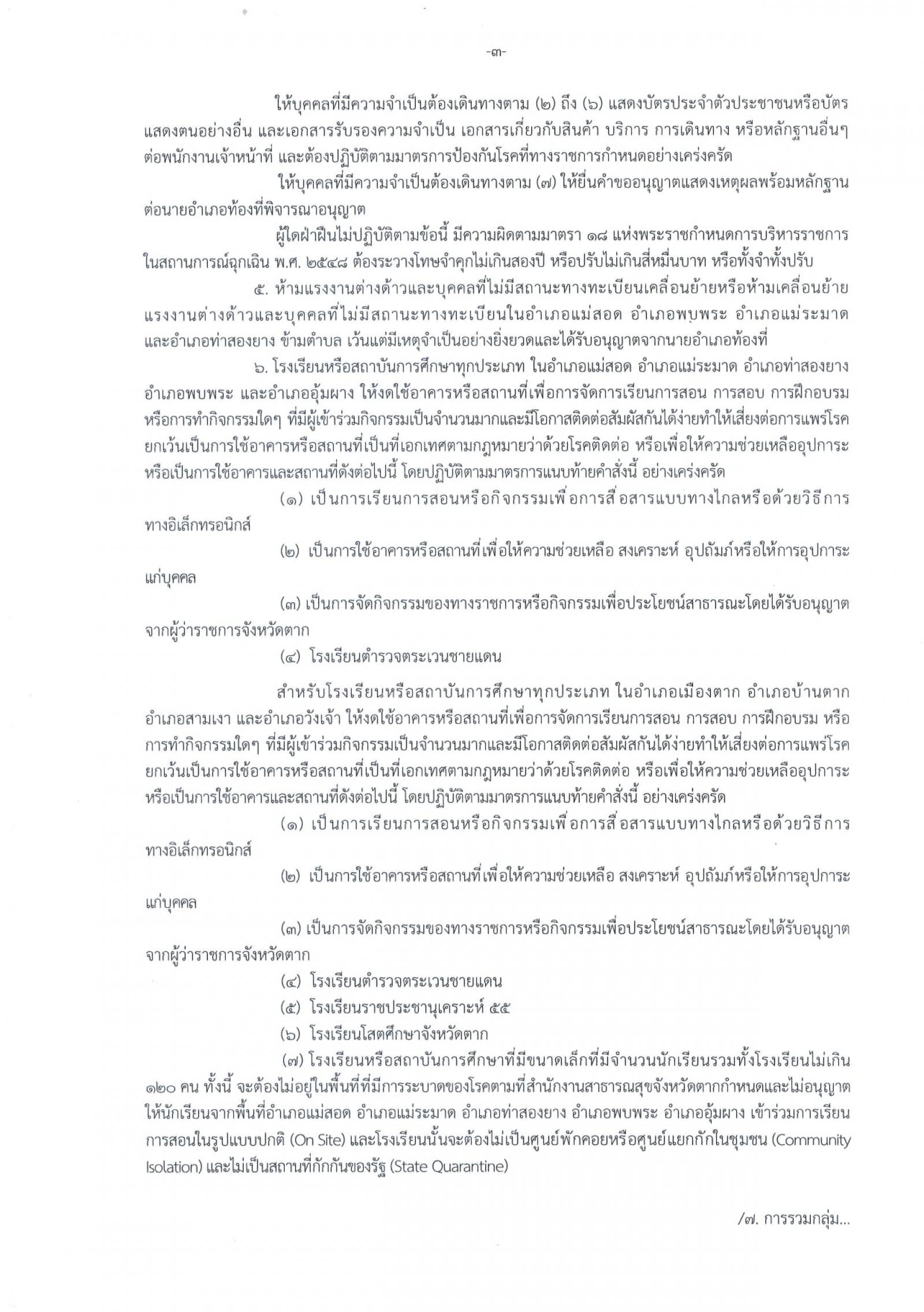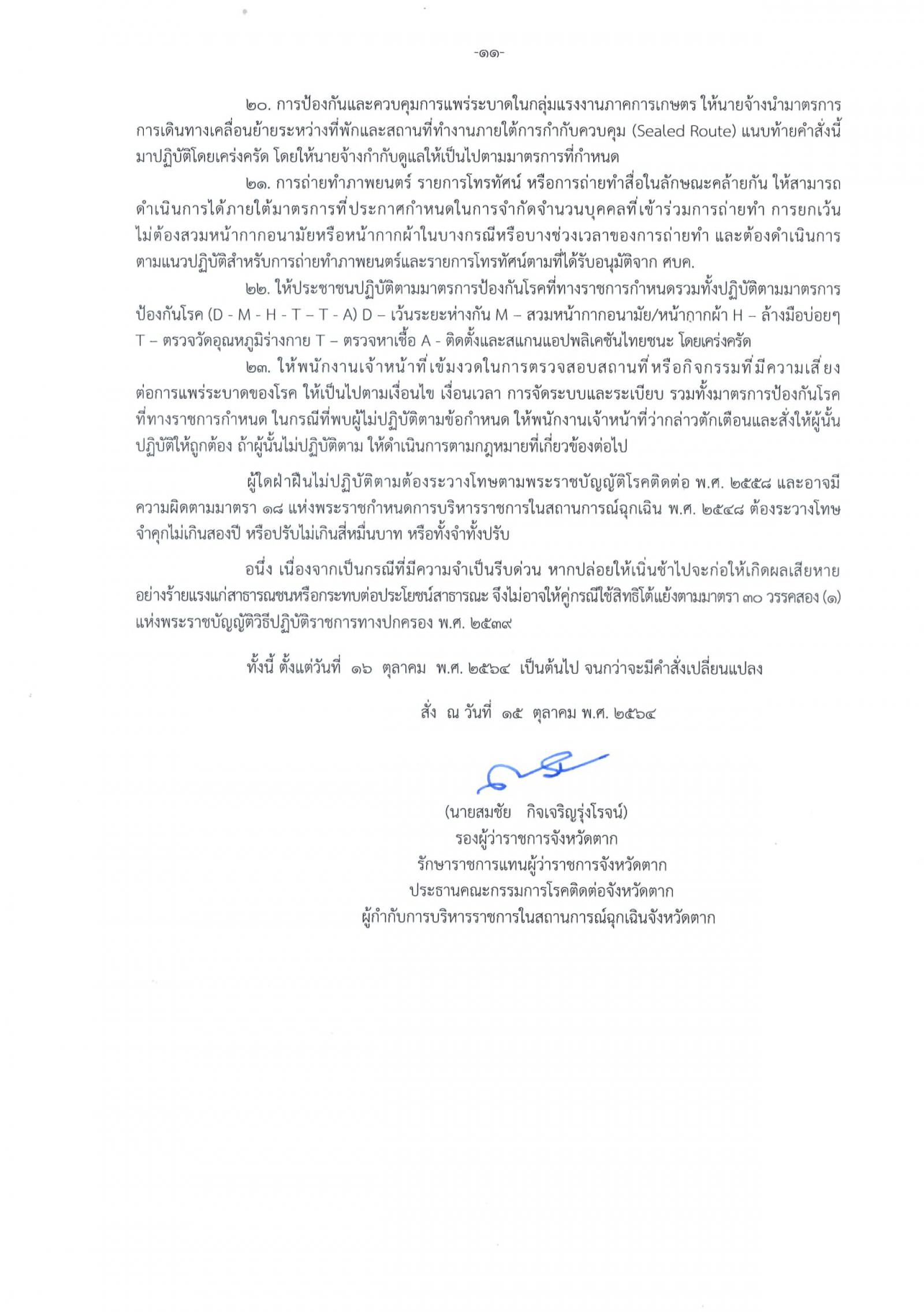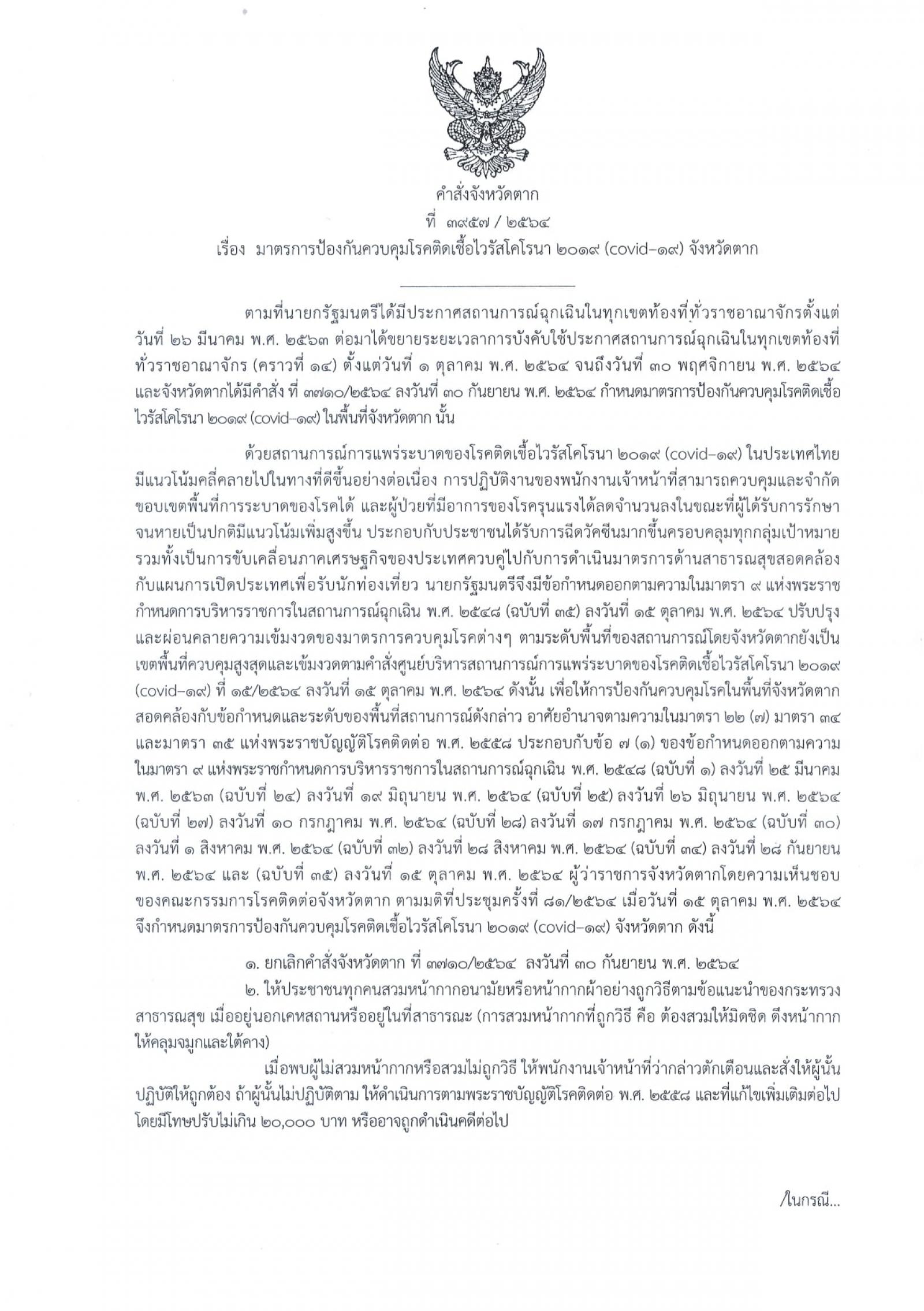 คำสั่งจังหวัดตาก ที่ 3957/ 2564 เรื่อง มาตรการป้องกัน ควบคุมโรคติดเชื้อไวรัสโคโรนา 2019 (covid–19) จังหวัดตาก