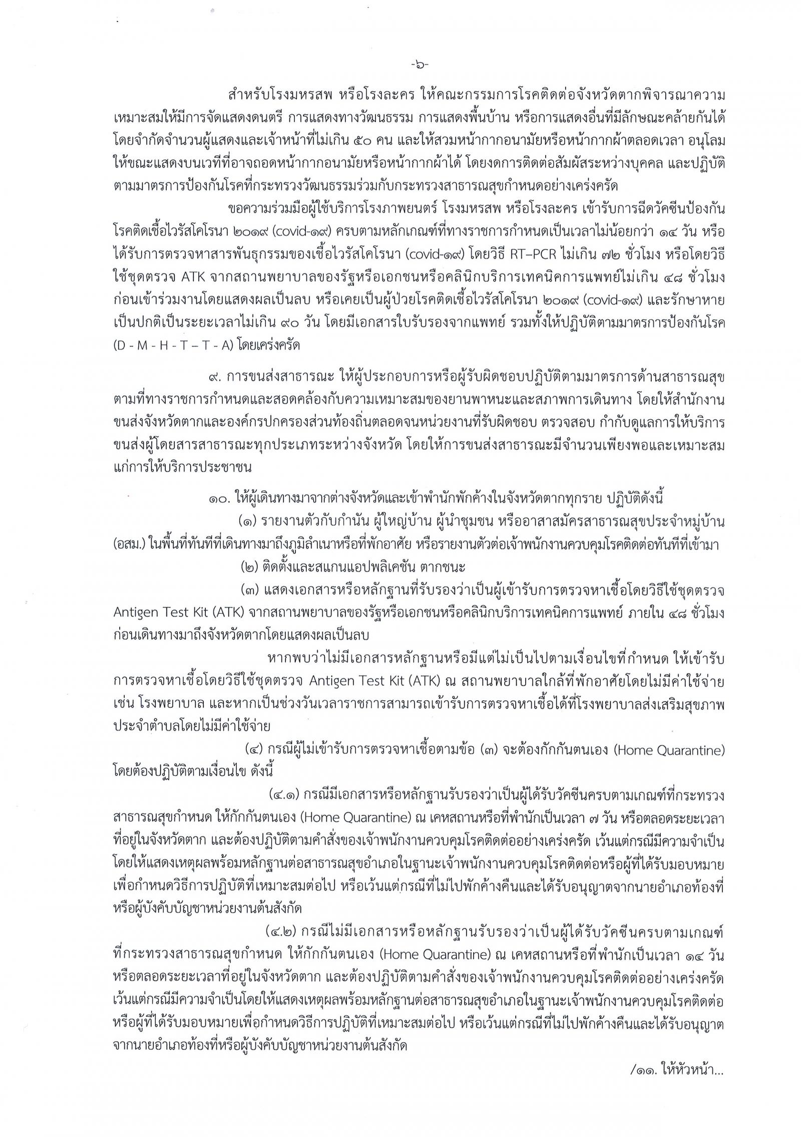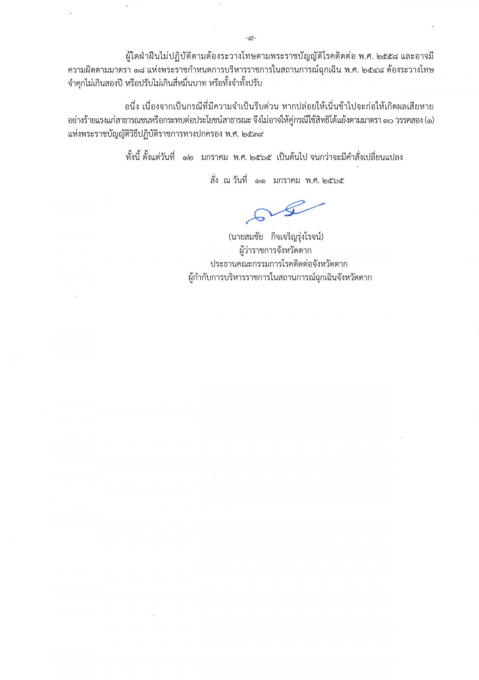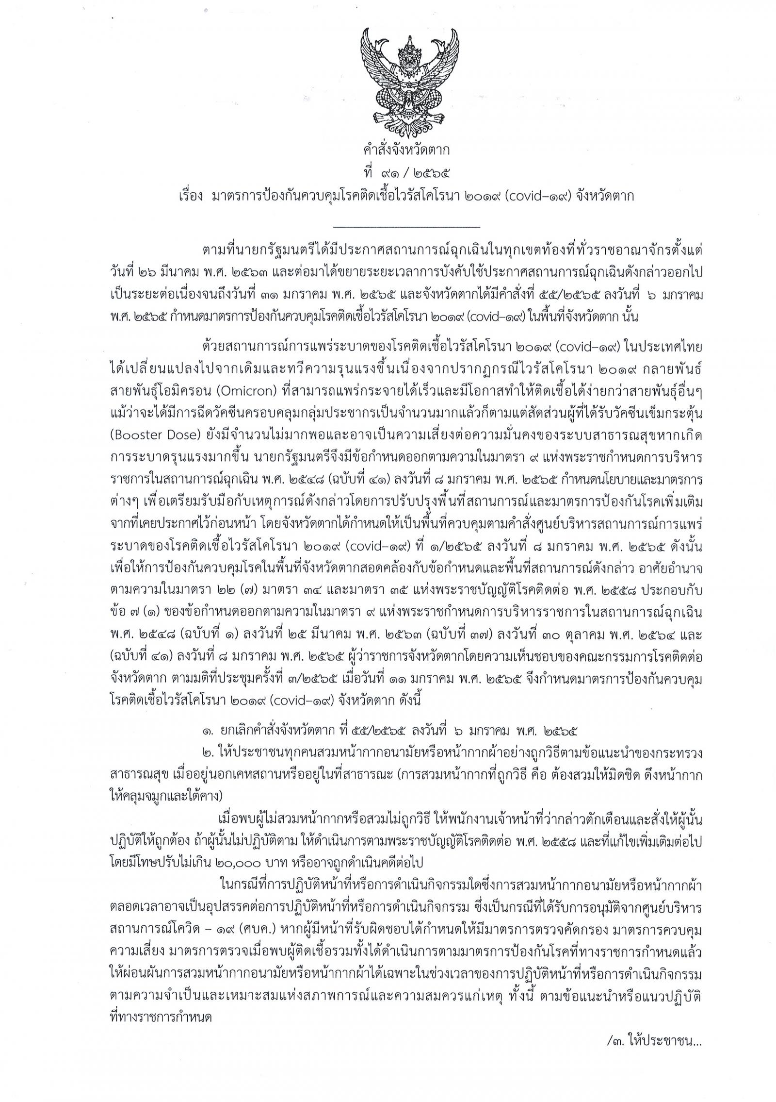 คำสั่งจังหวัดตาก ที่ 91/2565 เรื่อง มาตรการป้องกันควบคุมโรคติดเชื้อไวรัสโคโรนา 2019 (covid–19) จังหวัดตาก