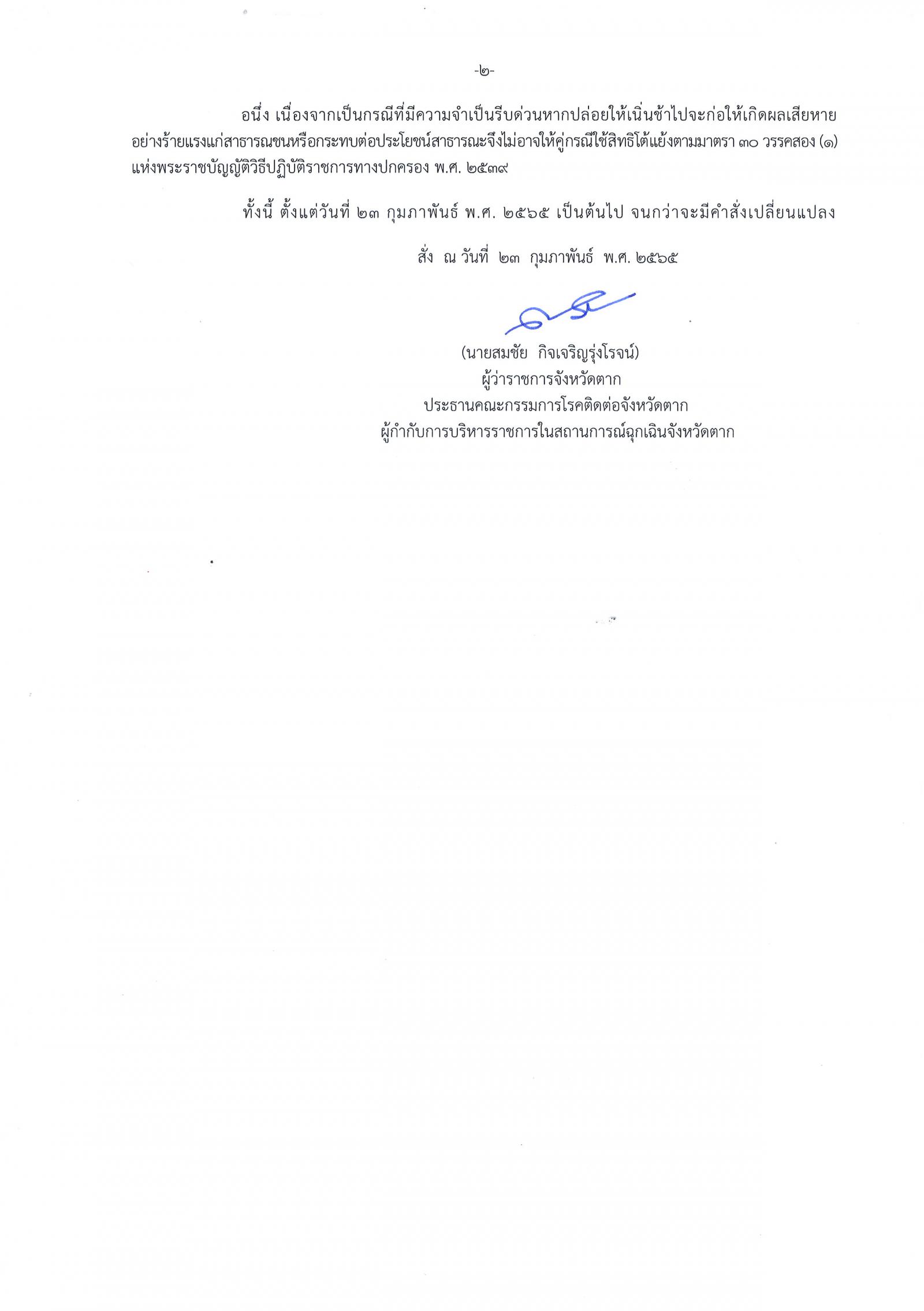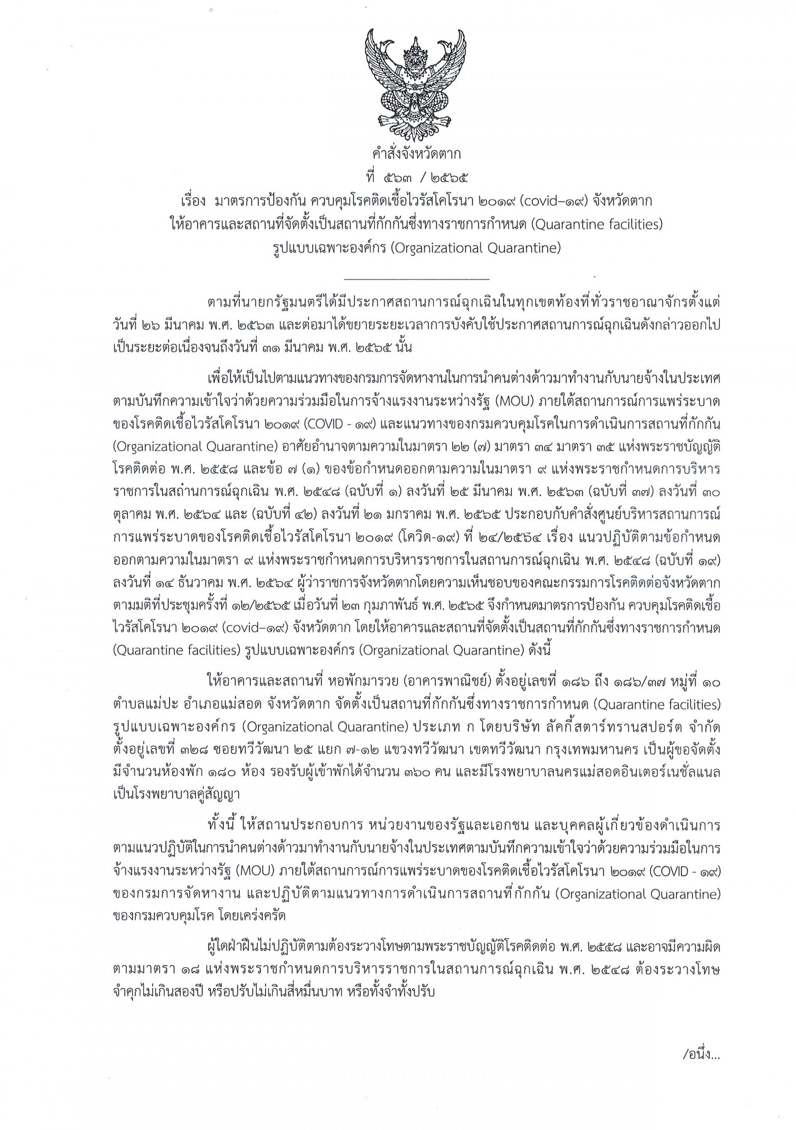 คำสั่งจังหวัดตากที่ 563 / 2565 เรื่อง มาตรการป้องกัน ควบคุมโรคติดเชื้อไวรัสโคโรนา 2019 (covid–19) จังหวัดตาก ให้อาคารและสถานที่จัดตั้งเป็นสถานที่กักกันซึ่งทางราชการกำหนด (Quarantine facilities) รูปแบบเฉพาะองค์กร (Organizational Quarantine)
