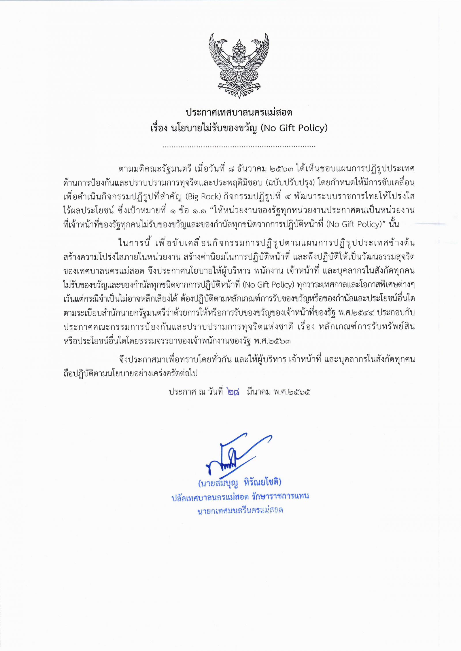 ประกาศเทศบาลนครแม่สอด เรื่อง นโยบายไม่รับของขวัญ (No Gift Policy)