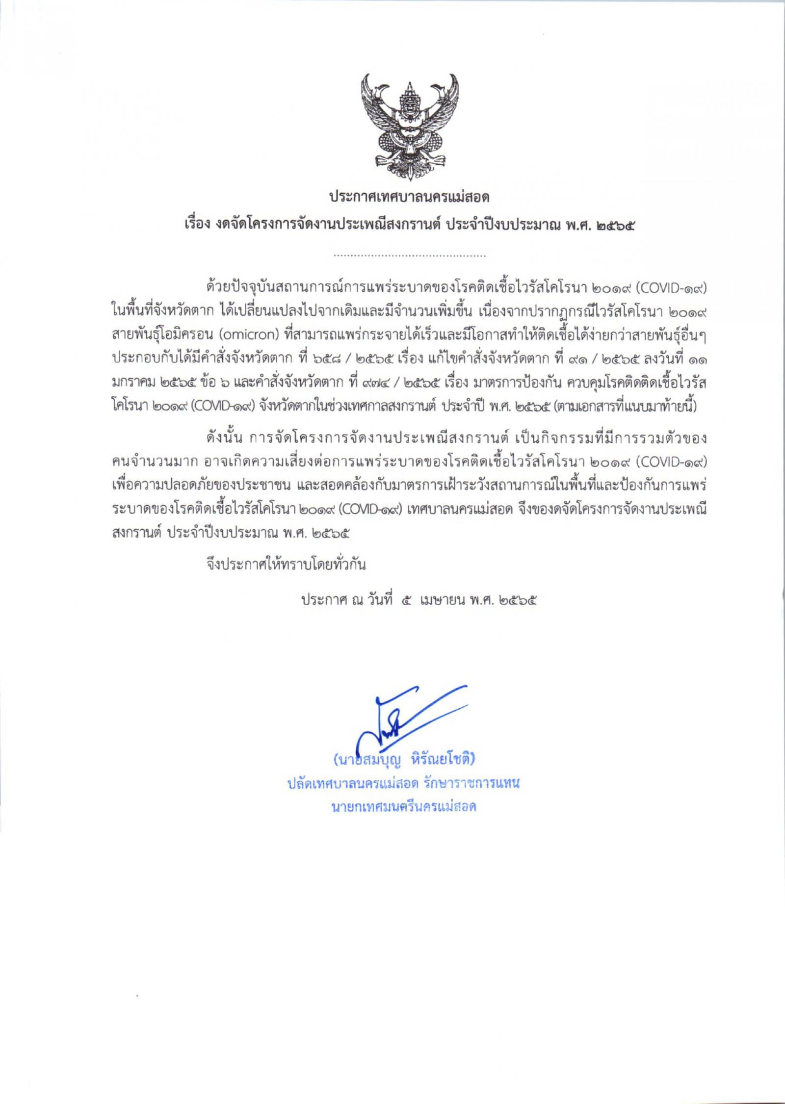 เทศบาลนครแม่สอด ประกาศงดจัดโครงการจัดงานประเพณีสงกรานต์ ประจำปีงบประมาณ พ.ศ.2565 เนื่องจากสถานการณ์การแพร่ระบาดของโรคติดเชื้อไวรัสโคโรน่า 2019
