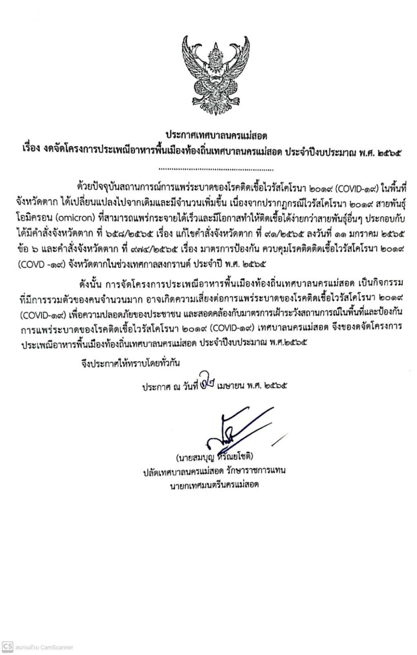 ประกาศเทศบาลนครแม่สอด เรื่อง งดจัดโครงการประเพณีอาหารพื้นเมืองท้องถิ่นเทศบาลนครแม่สอด ประจำปีงบประมาณ พ.ศ.2565