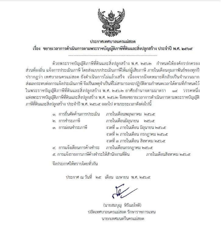 ประกาศเทศบาลนครแม่สอด เรื่อง ขยายเวลาการดำเนินการตามพระราชบัญญัติภาษีที่ดินและสิ่งปลูกสร้าง ประจำปี พ.ศ. 2565