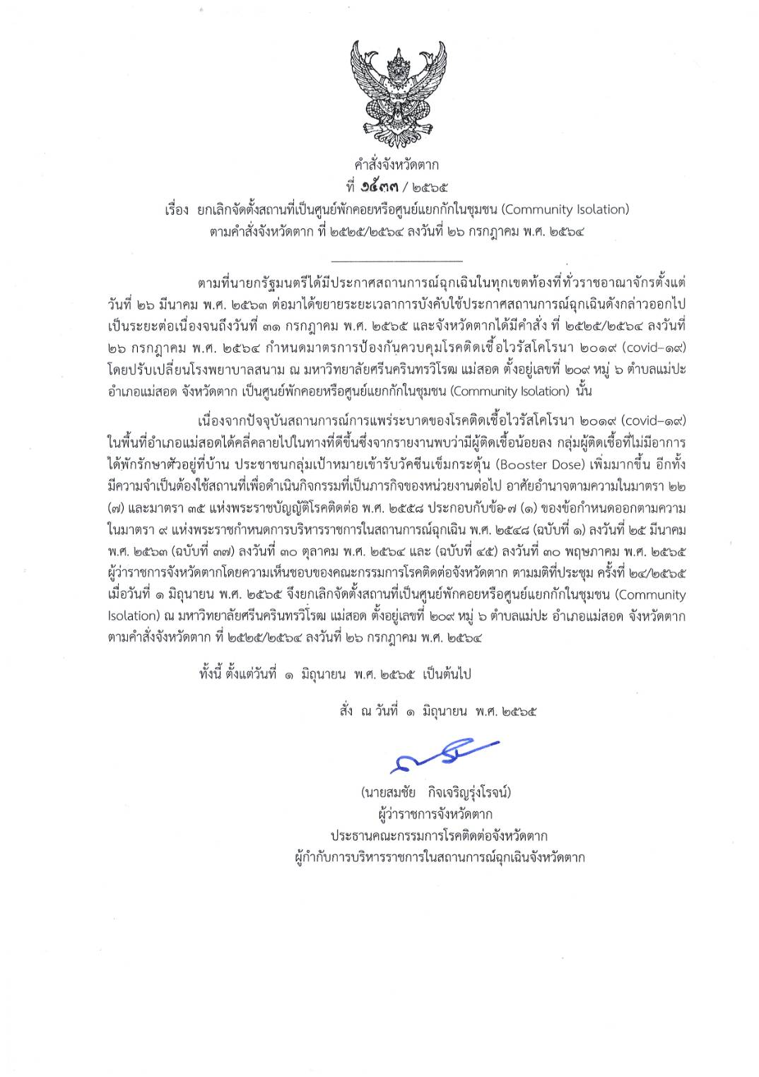 คำสั่งจังหวัดตาก ที่ 1533/2565 เรื่อง ยกเลิกจัดตั้งสถานที่เป็นศูนย์พักคอยหรือศูนย์แยกกักในชุมชน (Community Isolation) ตามคำสั่งจังหวัดตาก ที่ 2525/2564 ลงวันที่ 26 กรกฎาคม พ.ศ.2564 สั่ง ณ วันที่ 1 มิถุนายน พ.ศ.2565