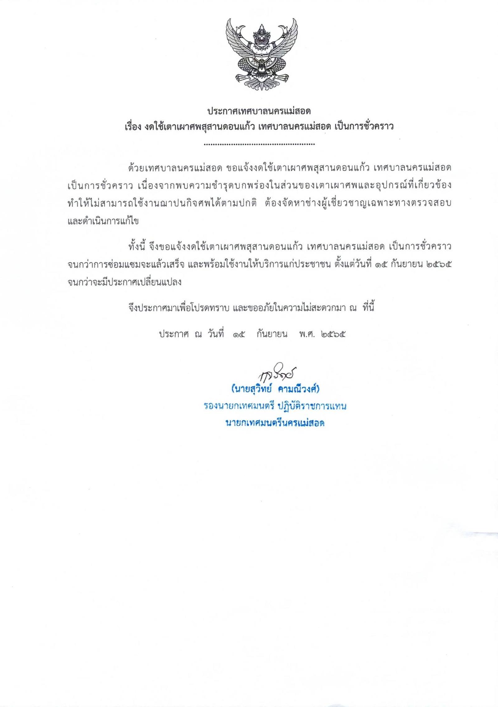 ประชาสัมพันธ์ประกาศเทศบาลนครแม่สอด เรื่อง งดใช้เตาเผาศพสุสานดอนแก้ว เทศบาลนครแม่สอด เป็นการชั่วคราว เนื่องจากพบความชำรุดบกพร่องในส่วนของเตาเผาศพ ทั้งนี้จนกว่าจะซ่อมแซมแล้วเสร็จ พร้อมใช้งาน จึงของดใช้เตาเผาศพ ตั้งแต่วันที่ 15 กันยายน 2565 จนกว่าจะมีประกาศเปลี่ยนแปลง