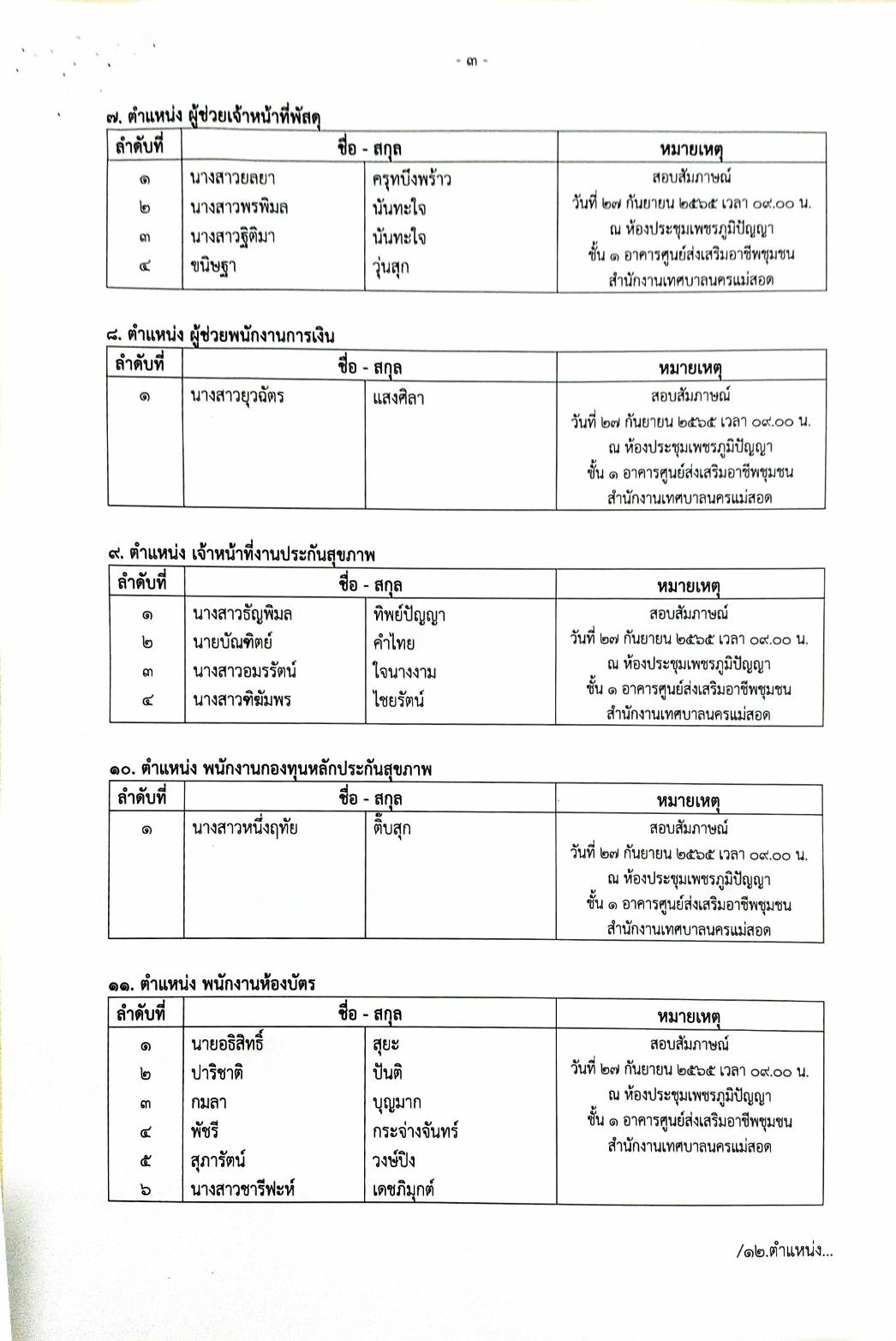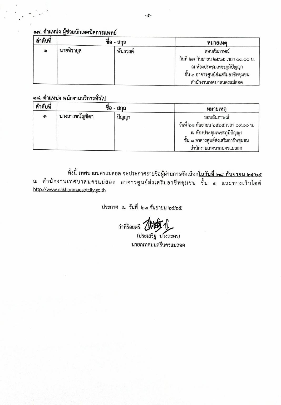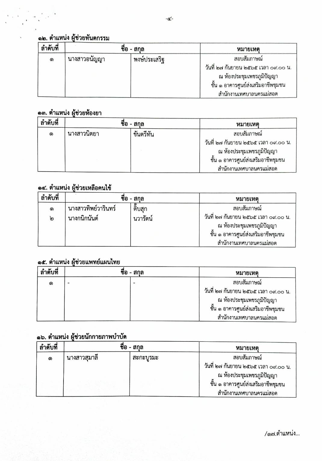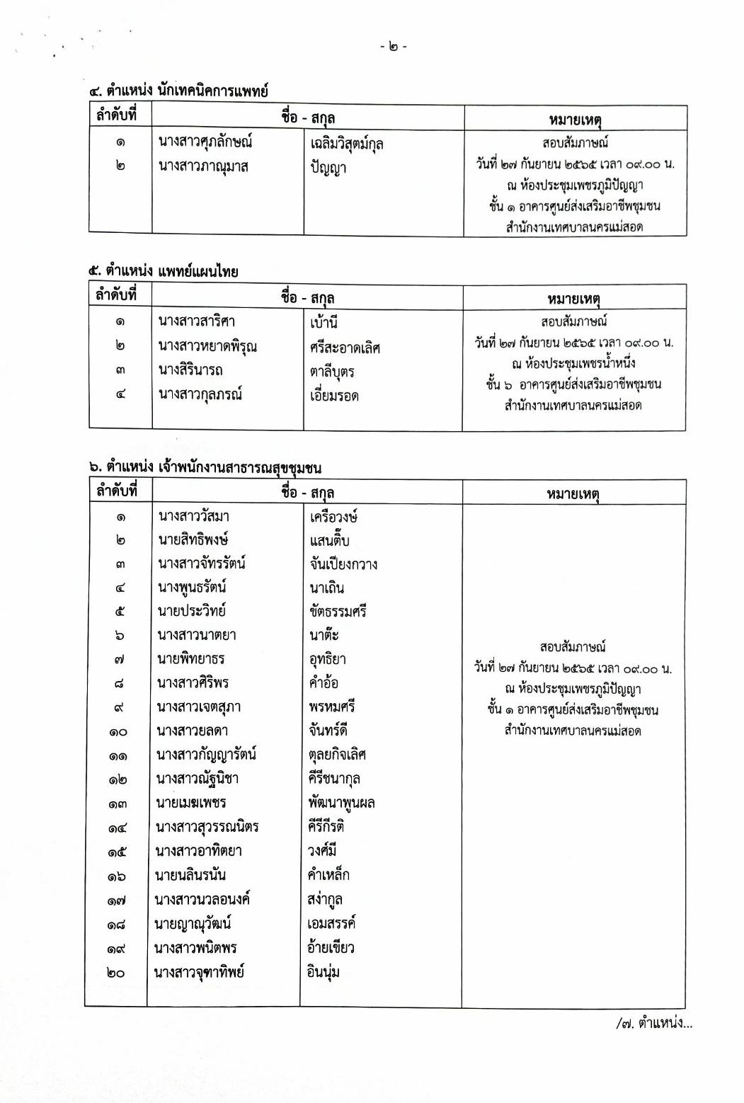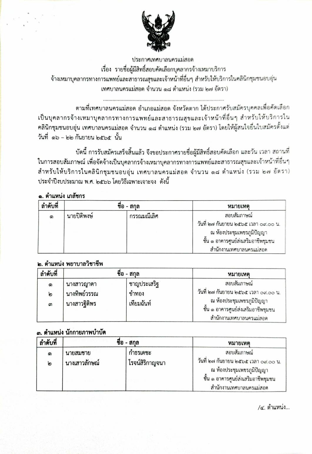 ประกาศเทศบาลนครแม่สอด เรื่อง รายชื่อผู้มีสิทธิ์สอบคัดเลือกบุคลากรจ้างเหมาบริการ จ้างเหมาบุคลากรทางการแพทย์และสาธารณสุขและเจ้าหน้าที่อื่นๆสำหรับให้บริการในคลินิกชุมชนอบอุ่นเทศบาลนครแม่สอด จำนวน 18 ตำแหน่ง (รวม 27 อัตรา)