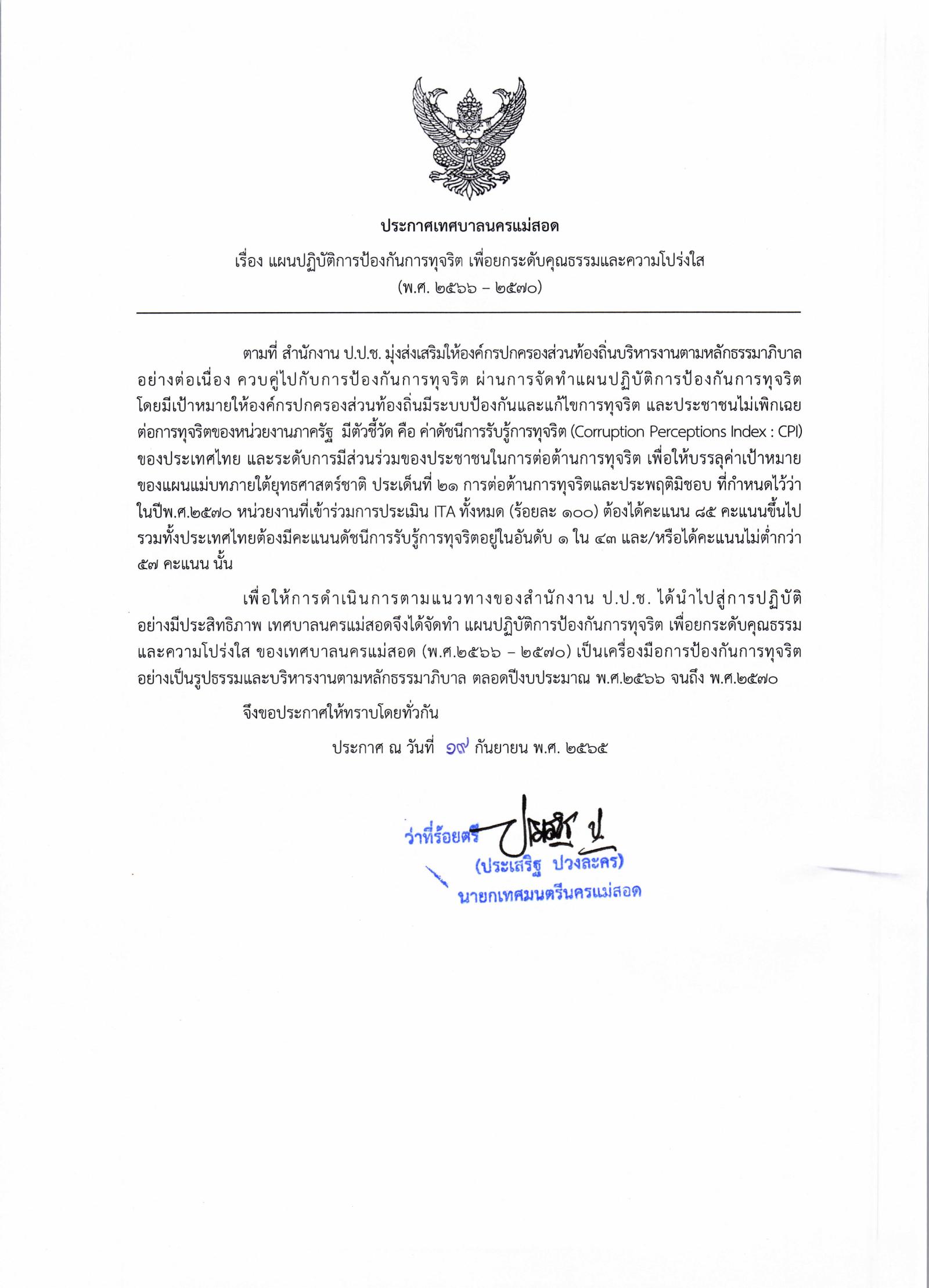 สามารถดาวน์โหลดแผนปฏิบัติการป้องกันการทุจริต เพื่อยกระดับคุณธรรมและความโปร่งใส (พ.ศ.2566 - 2570) >> https://www.nakhonmaesotcity.go.th/web/th/grouppage/6/page/Plan_Protect_Corruption.html