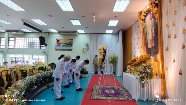 ว่าที่ร้อยตรีประเสริฐ ปวงละคร นายกเทศมนตรี พร้อมด้วยนายกรกฤตย์ กรัณยพัฒนพงษ์ เลขานุการนายก สมาชิกเทศบาลนครแม่สอด ข้าราชการและเจ้าหน้าที่เทศบาลนครแม่สอด เข้าร่วมพิธีวางพวงมาลาถวายราชสักการะพระบาทสมเด็จพระบรมชนกาธิเบศร มหาภูมิพลอดุลยเดชมหาราช บรมนาถบพิตร เนื่องในวันคล้ายวันสวรรคต โดยมีนายสมชาย ไตรทิพย์ชาติสกุล นายอำเภอแม่สอด เป็นประธานในพิธี พร้อมด้วยส่วนราชการ หน่วยงานรัฐวิสาหกิจ องค์กรเอกชน และภาคประชาชนในพื้นที่อำเภอแม่สอด จังหวัดตาก ร่วมเป็นเกียรติ ในพิธีวางพวงมาลาถวายราชสักการะ เพื่อน้อมรำลึกในพระมหากรุณาธิคุณอันหาที่สุดมิได้