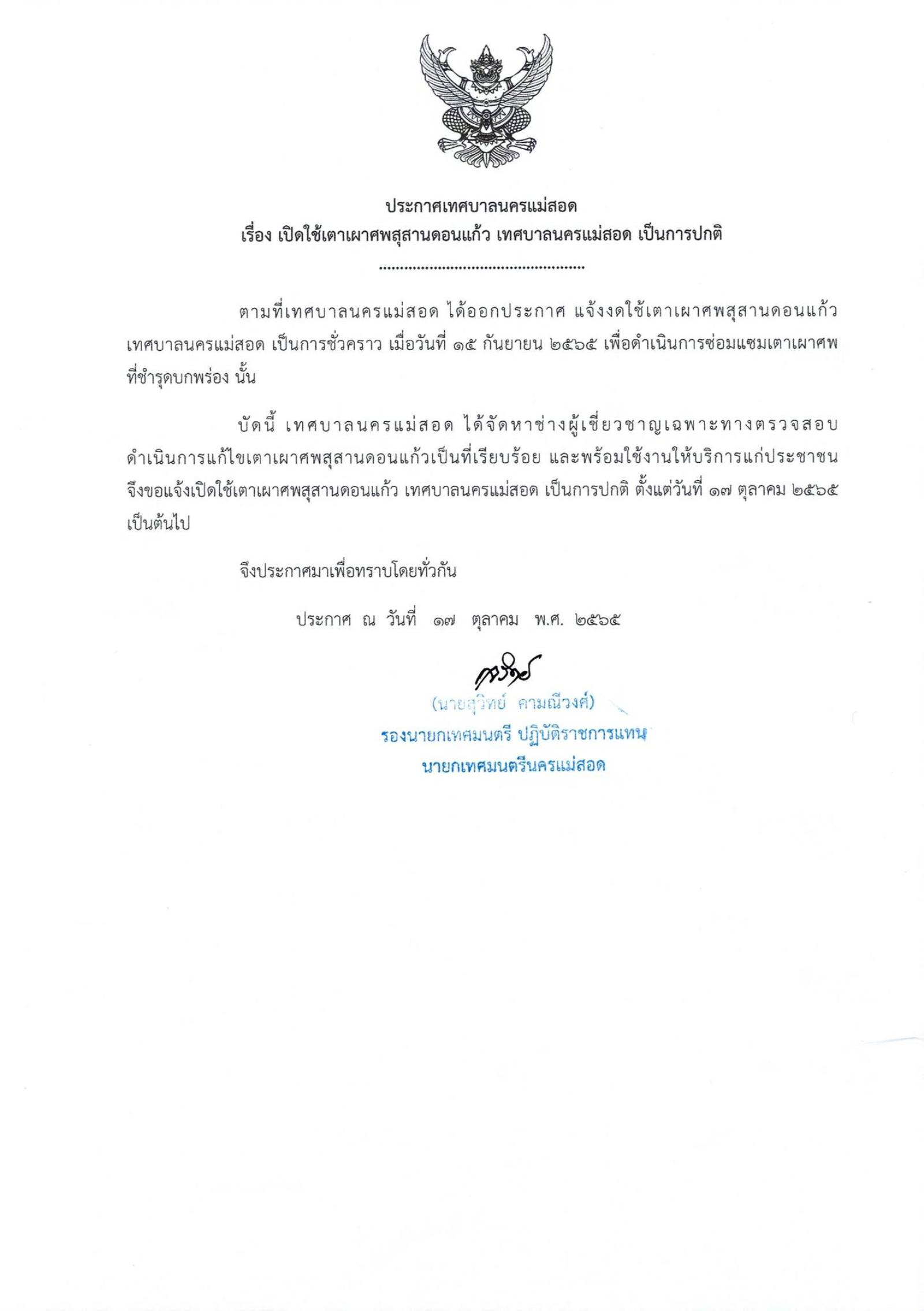 ประชาสัมพันธ์ประกาศเทศบาลนครแม่สอด เรื่องเปิดใช้เตาเผาสุสานดอนแก้ว เทศบาลนครแม่สอด เป็นการปกติ ตั้งแต่วันที่ 17 ตุลาคม 2565 เป็นต้นไป