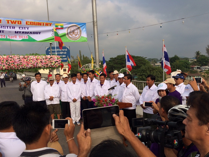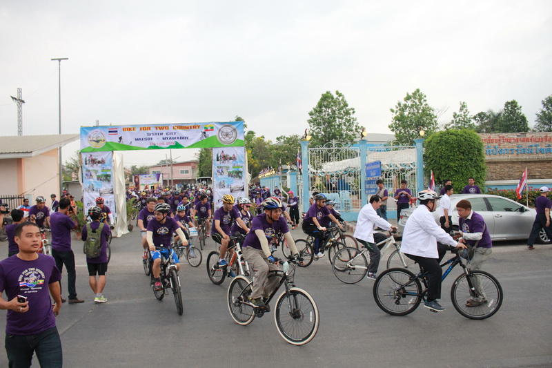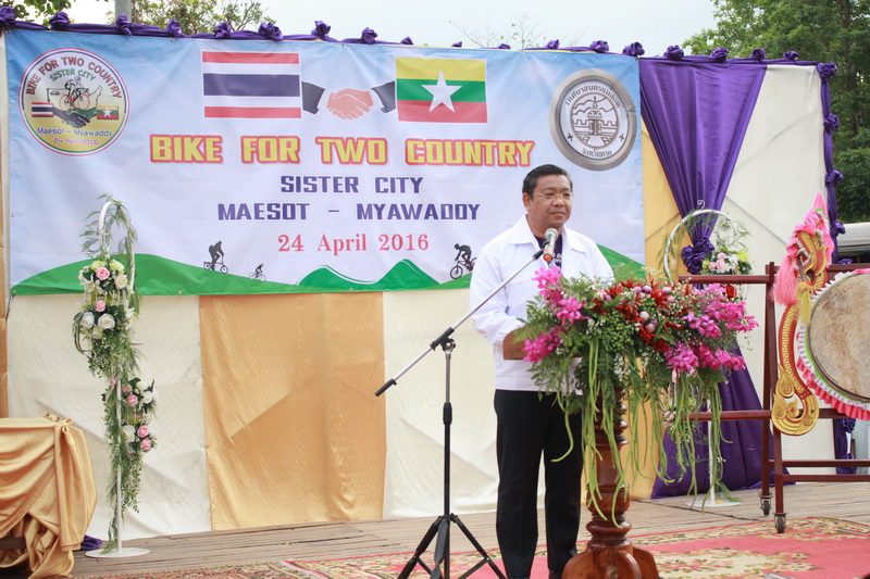 24 เม.ย. 59 เวลา 07.00 น. ที่ศาลสมเด็จพระนเรศวรมหาราช เทศบาลนครแม่สอด อำเภอแม่สอด จังหวัดตาก นายเจริญฤทธิ์ สงวนสัตย์ ผู้ว่าราชการจังหวัดตาก เป็นประธานพิธีเปิด กิจกรรมการปั่นจักรยานมิตรภาพไทย-เมียนมา 2 แผ่นดิน Bike For Two Country-Sister City Maesot-Myawaddy โดยได้รับเกียรติจาก นายสุทธา สายวาณิชย์ รองผู้ว่าราชการจังหวัดตาก นายธนยศ ปานขาว นายอำเภอแม่สอด พร้อมด้วยหัวหน้าส่วนราชการ ภาครัฐ-เอกชน ชาวไทย-เมียนมาร์ และประชาชนในเขตพื้นที่เข้าร่วมกิจกรรม จำนวนกว่า 1,000 คน