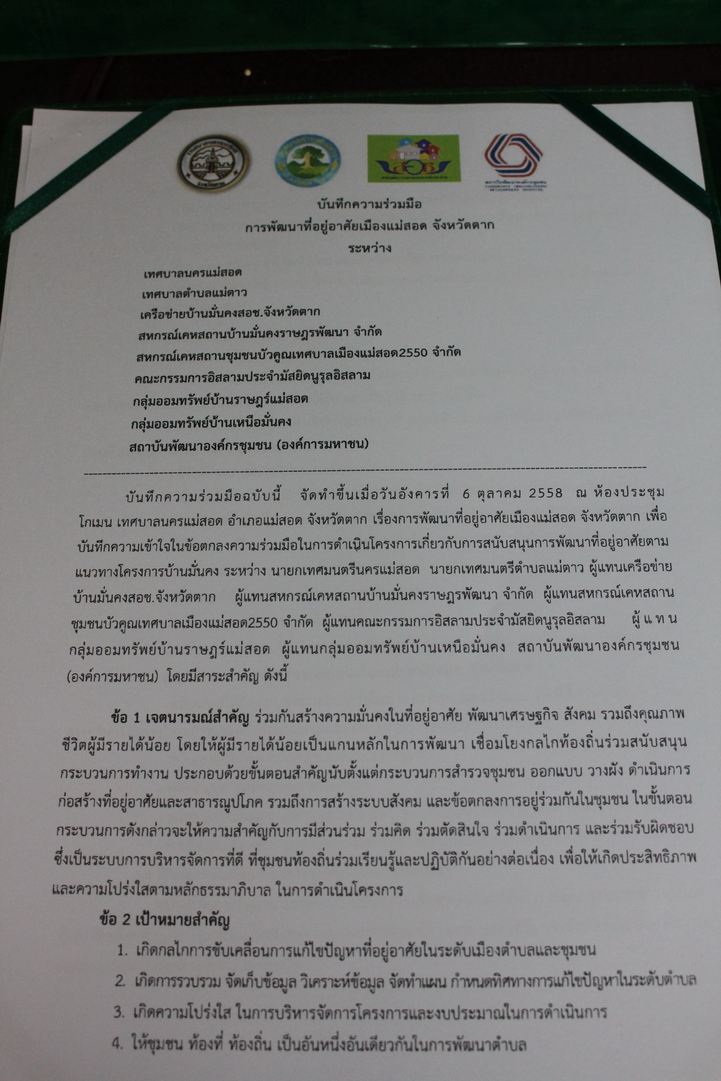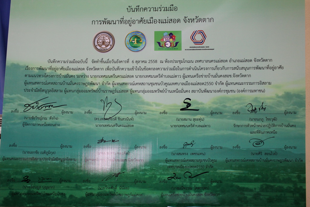 เทศบาลนครแม่สอด , เทศบาลตำบลแม่ตาว , เครือข่ายบ้านมั่งคงสอช.จังหวัดตาก , สหกรณ์เคหสถานบ้านมั่งคงราษฎรพัฒนา จำกัด , สหกรณ์เคหสถานชุมชนบัวคูณเทศบาลเมืองแม่สอด2550 จำกัด ,