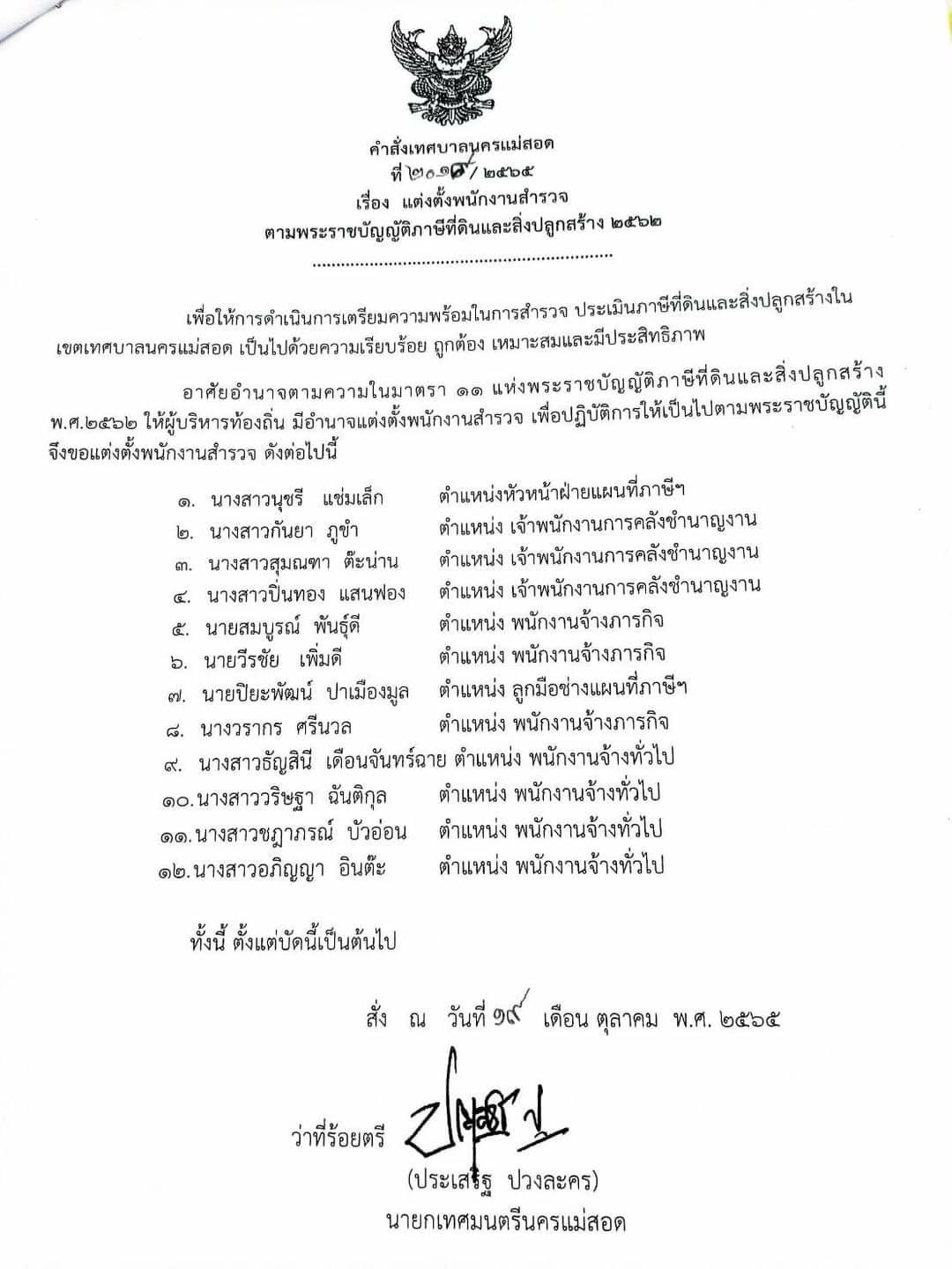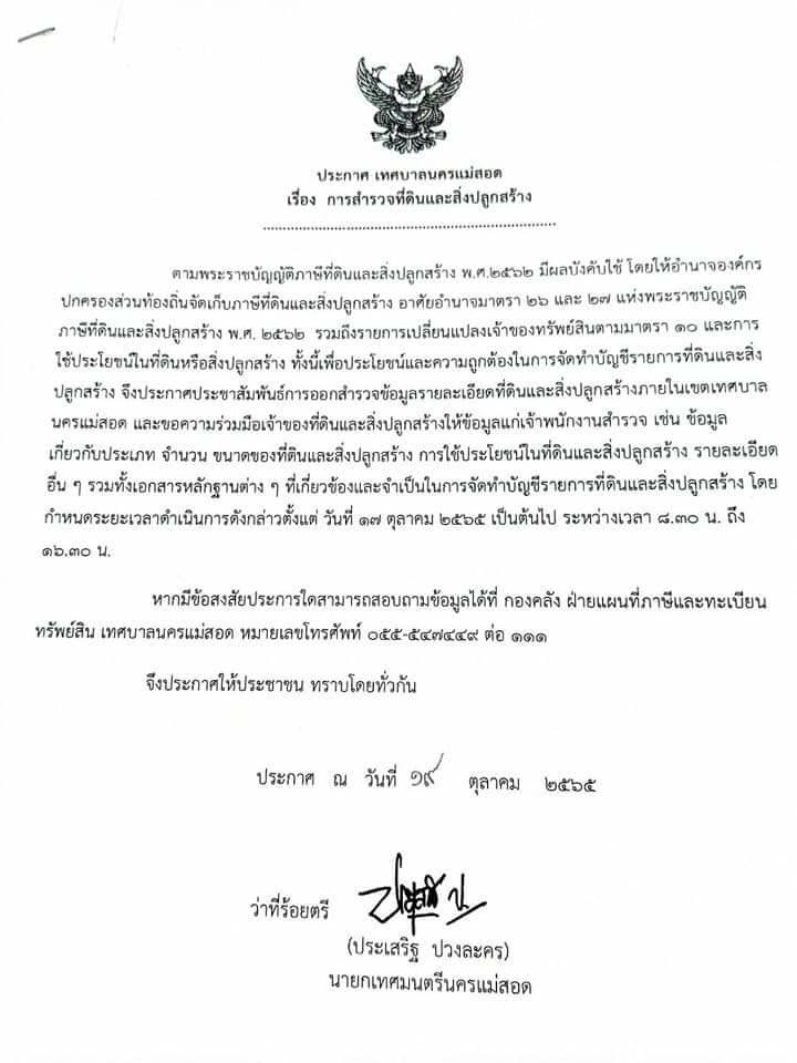 ประกาศเทศบาลนครแม่สอด เรื่อง การสำรวจที่ดินและสิ่งก่อสร้าง