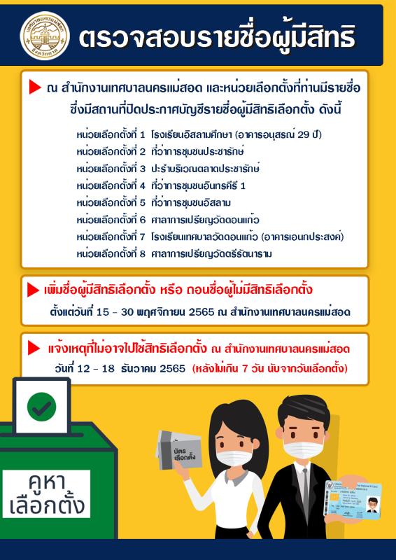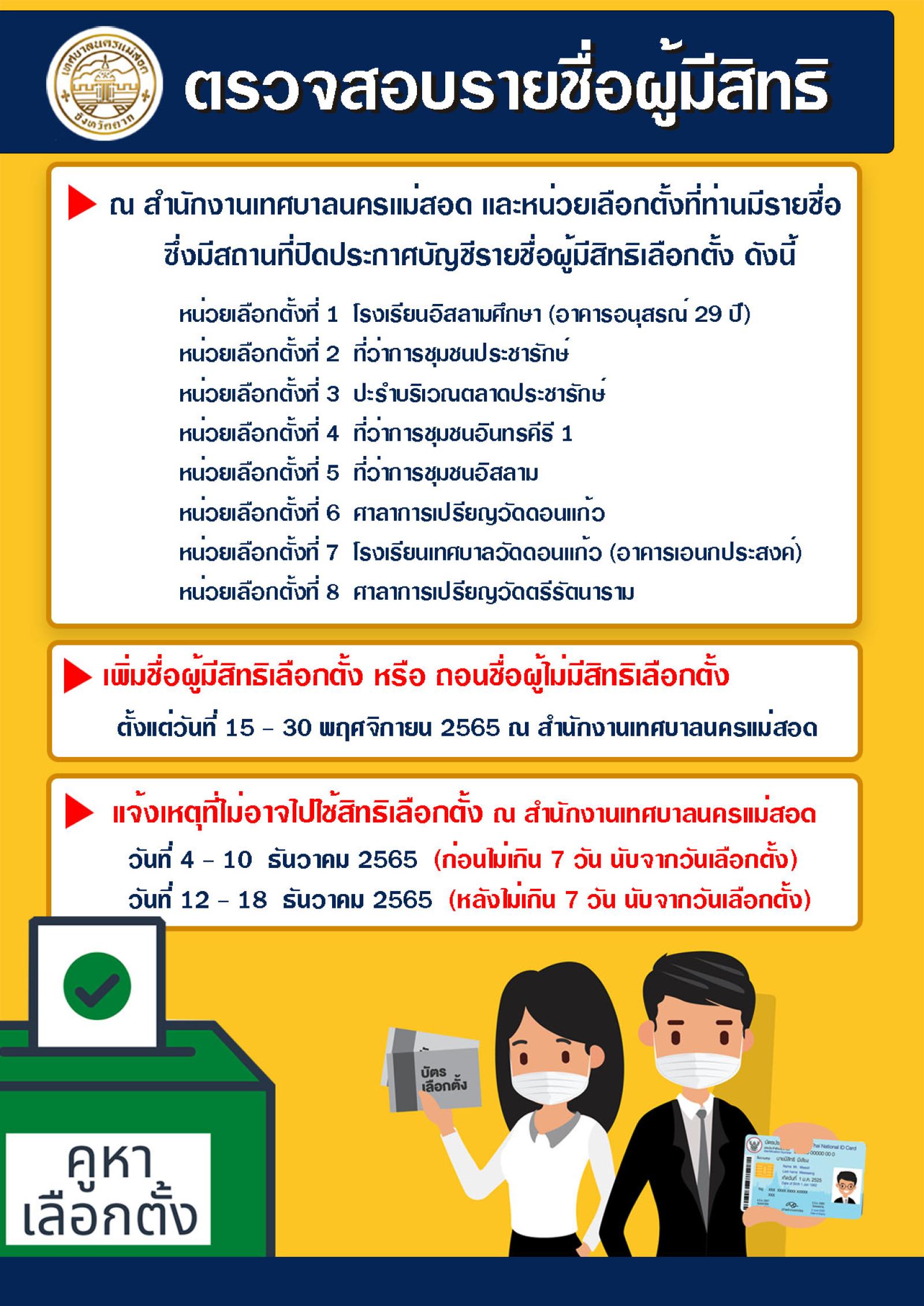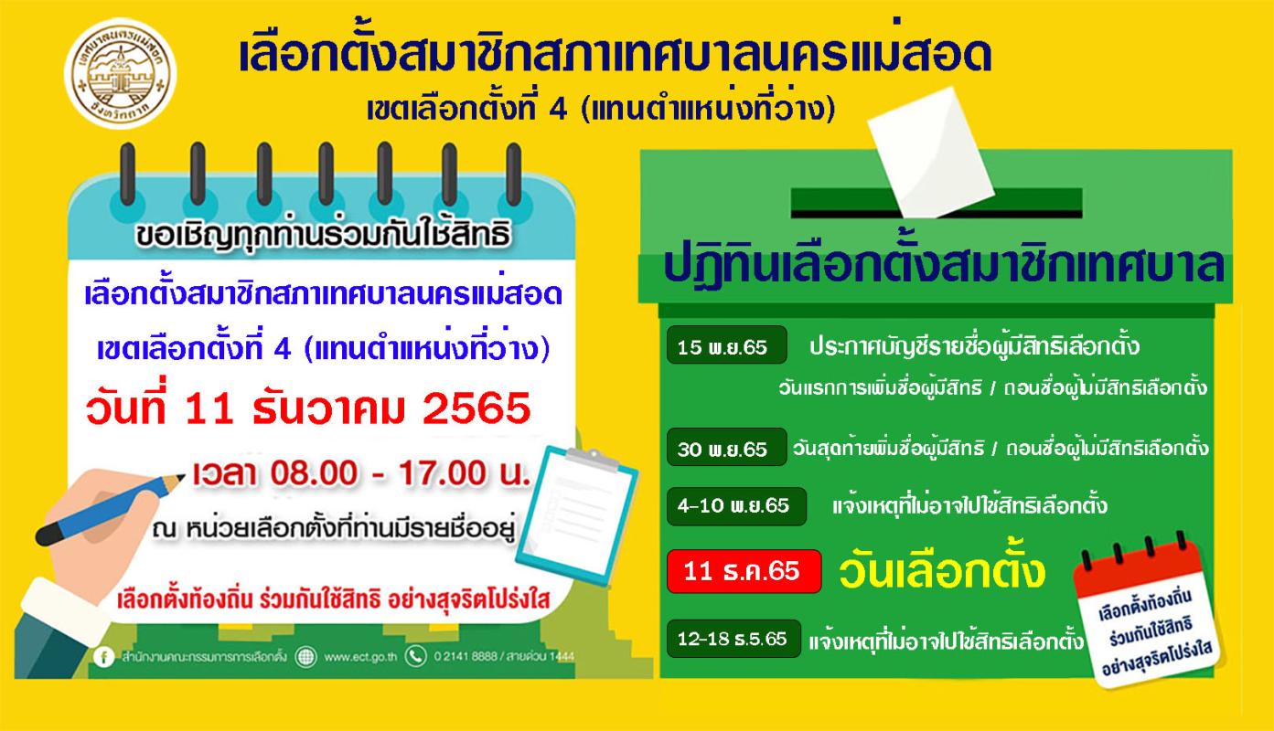 ขอเชิญชวนทุกท่านร่วมกันใช้สิทธิ เลือกตั้งสมาชิกสภาเทศบาลนครแม่สอด เขตเลือกตั้งที่ 4 (แทนตำแหน่งที่ว่าง)