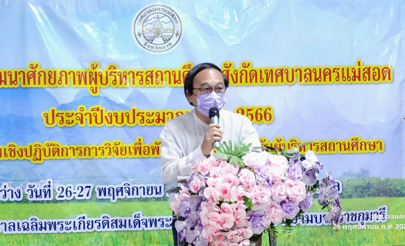 ว่าที่ร้อยตรีประเสริฐ ปวงละคร นายกเทศมนตรีนครแม่สอด ประธานในพิธีเปิด พร้อมด้วยคณะผู้บริหาร สมาชิกสภาเทศบาลนครแม่สอด คณะครูอาจารย์ ข้าราชการ และเจ้าหน้าที่ที่เกี่ยวข้อง เข้าร่วมโครงการพัฒนาศักยภาพผู้บริหารสถานศึกษาสังกัดเทศบาลนครแม่สอด ประจำปีงบประมาณ พ.ศ. 2566 โดยนายพีระ วงค์หมอ ผู้อำนวยการกองการศึกษา กล่าวรายงานวัตถุประสงค์การจัดโครงการ ฯ เพื่อจัดอบรมเชิงปฏิบัติการพัฒนาศักยภาพผู้บริหารสถานศึกษาสังกัดเทศบาลนครแม่สอด และเพื่อส่งเสริมศักยภาพผู้บริหารสถานศึกษาในสังกัดเทศบาลนครแม่สอด ด้วยการจัดการศึกษาดูงาน และการสัมมนาเชิงปฏิบัติการเกี่ยวกับการปฏิบัติงานในหน้าที่ผู้บริหารสถานศึกษา ทั้งนี้ได้รับความอนุเคราะห์ ดร.สลิลนา ภูมิพาณิชย์ ศึกษานิเทศก์ชำนาญการพิเศษ วิทยากรผู้ทรงคุณวุฒิด้านการวิจัยและพัฒนาหลักสูตรจากเทศบาล เมืองสวรรคโลก จังหวัดสุโขทัย