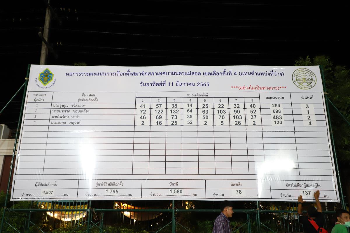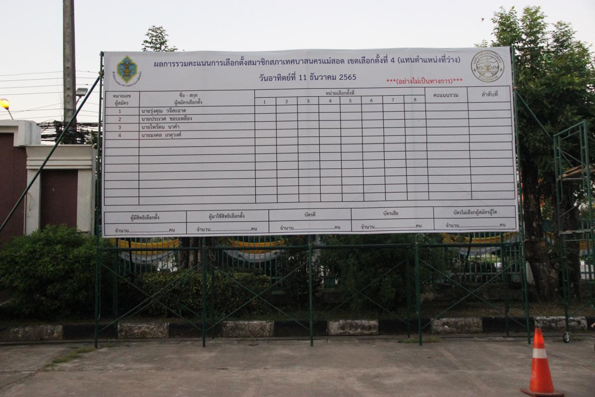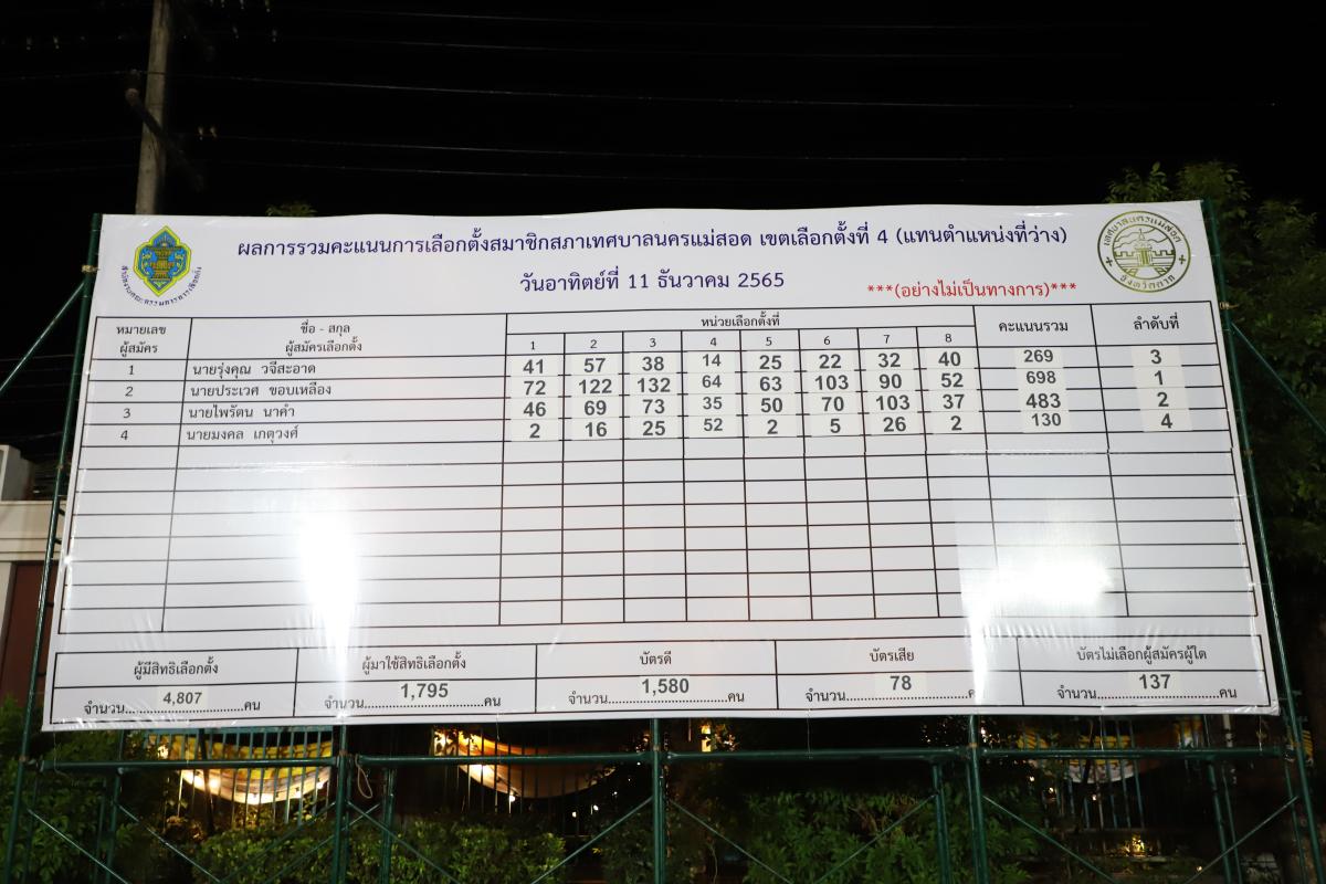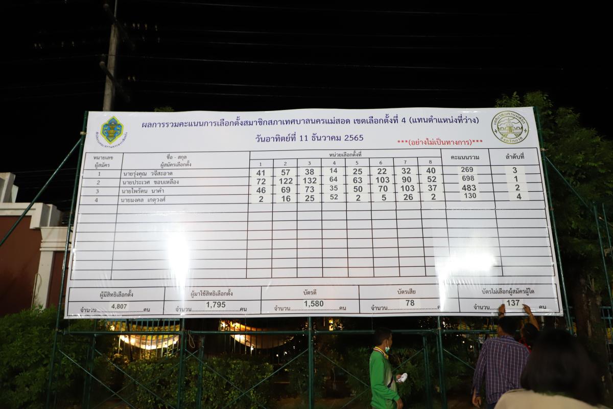 ได้นับผลการเลือกตั้งสมาชิกเทศบาล เขตเลือกตั้งที่ 4 (แทนตำแหน่งที่ว่าง) จากการเลือกตั้งในวันอาทิตย์ ที่ 11 ธันวาคม 2565 ตั้งแต่เวลา 08.00 – 17.00 น. (อย่างไม่เป็นทางการ) ดังนี้