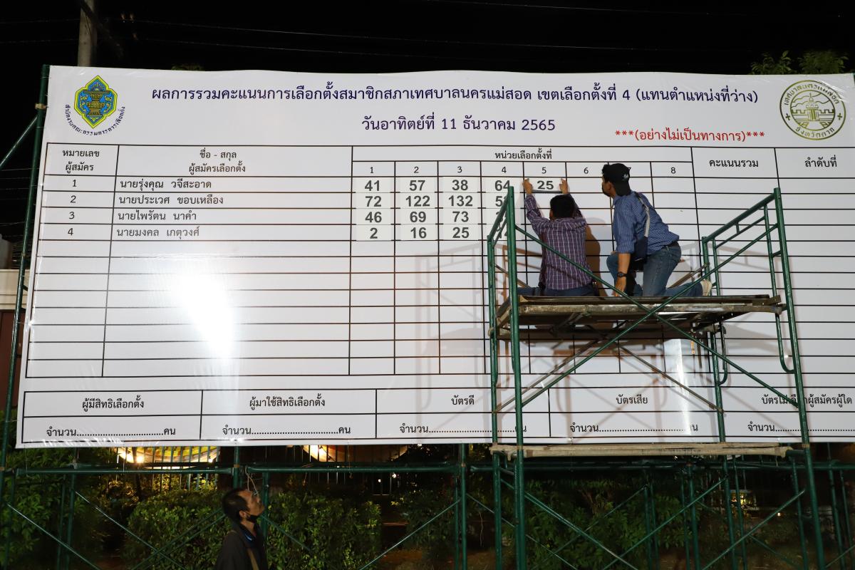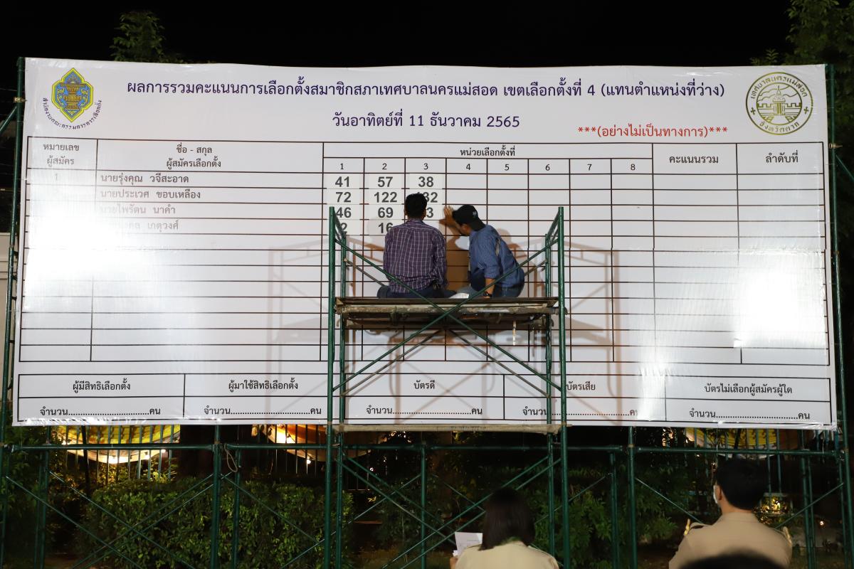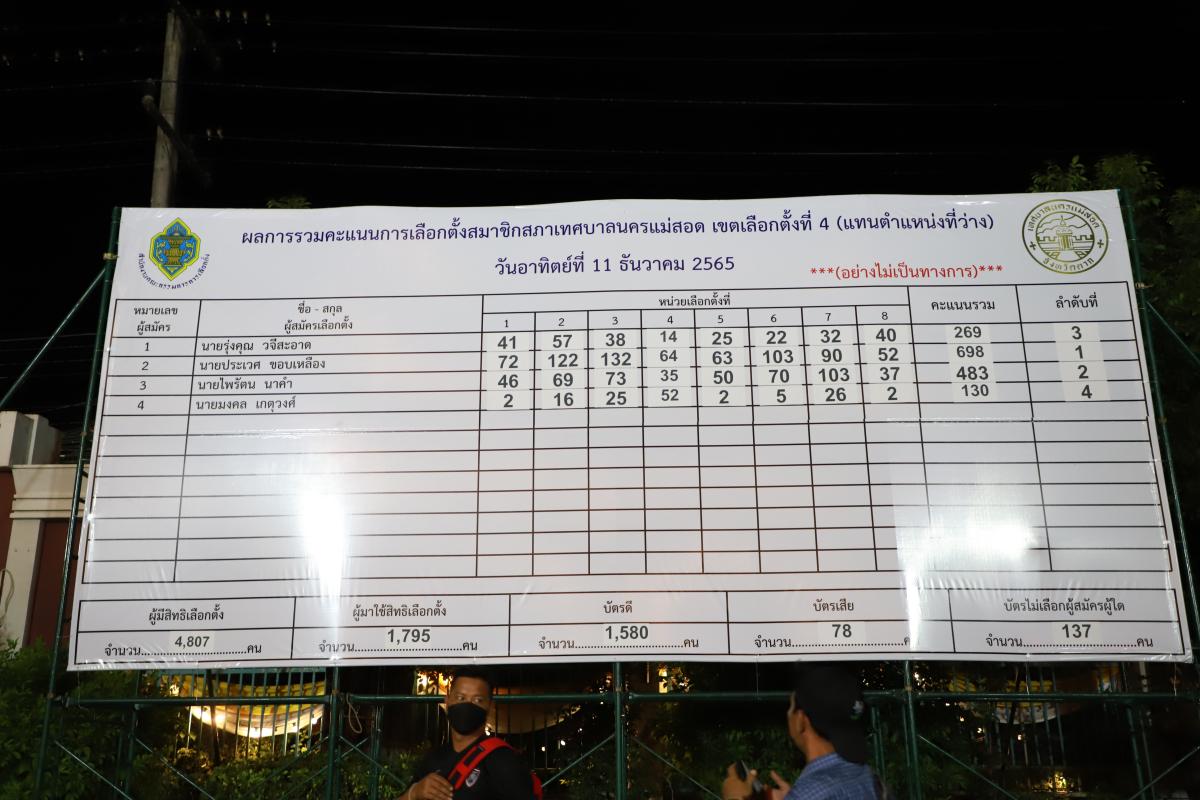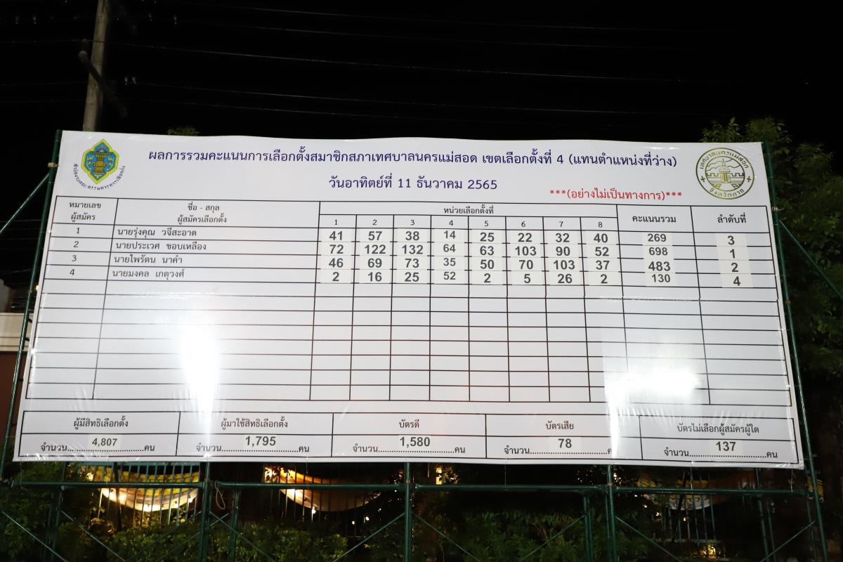 ได้นับผลการเลือกตั้งสมาชิกเทศบาล เขตเลือกตั้งที่ 4 (แทนตำแหน่งที่ว่าง) จากการเลือกตั้งในวันอาทิตย์ ที่ 11 ธันวาคม 2565 ตั้งแต่เวลา 08.00 – 17.00 น. (อย่างไม่เป็นทางการ) ดังนี้