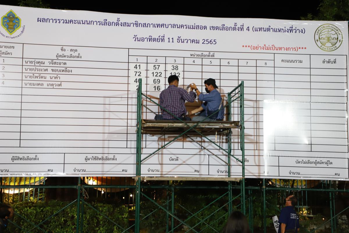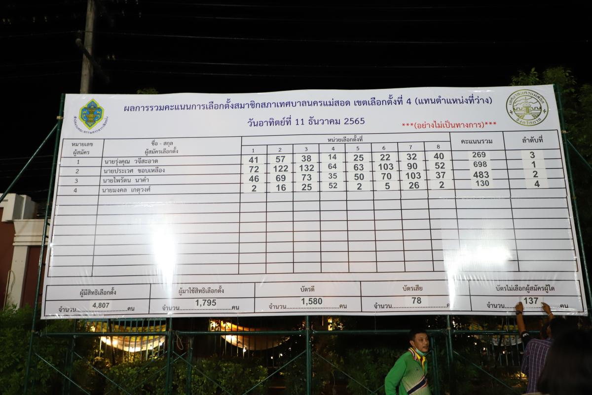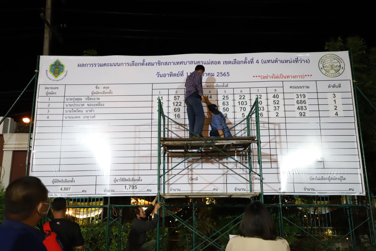 ซึ่งนางกิตติวรา วิริยา รองปลัดเทศบาล รักษาราชการแทนปลัดเทศบาลนครแม่สอด ปฏิบัติหน้าที่ผู้อำนวยการการเลือกตั้งประจำเทศบาลนครแม่สอด เป็นประธานการนับคะแนนเลือกตั้ง โดยมีคณะกรรมการการเลือกตั้งประจำจังหวัดตาก หัวหน้าส่วนราชการ และคณะกรรมการการเลือกตั้งประจำเทศบาลนครแม่สอด เป็นผู้สังเกตการณ์ เพื่อให้ไปด้วยความเรียบร้อย ถูกต้อง โปร่งใส และชอบด้วยกฎหมาย