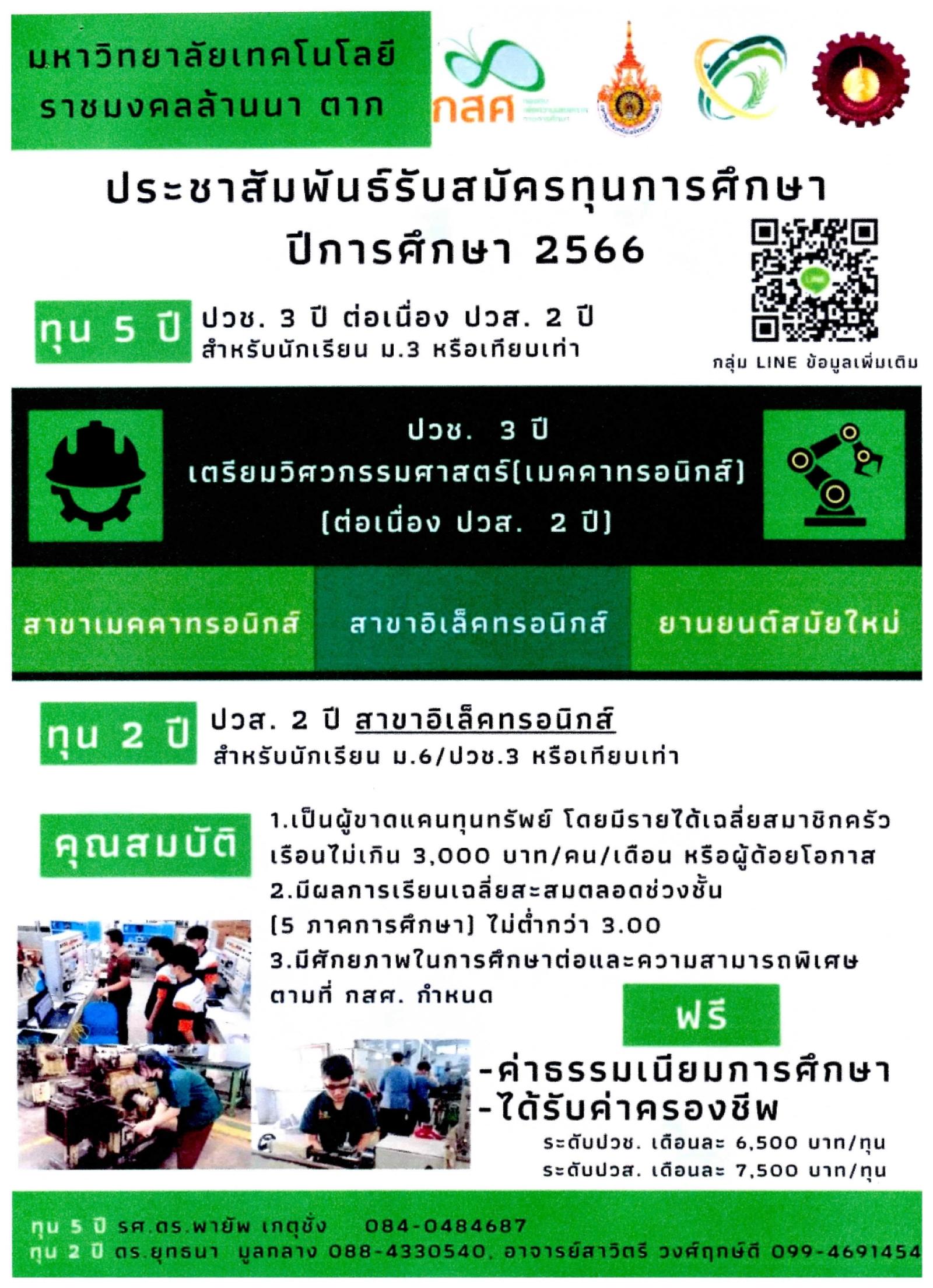 ประชาสัมพันธ์ โครงการนวัตกรรมสายอาชีพชั้นสูง ปีการศึกษา 2566 เพื่อสนับสนุนทุนการศึกษาต่อเนื่องสำหรับนักศึกษาระดับ ปวส./อนุปริญญา หลักสูตร ปวส.อิเล็กทรอนิกส์ และ ระดับ ปวช.ต่อเนื่อง ปวส. หลักสูตร ปวช.เตรียมวิศวกรรมศาสตร์