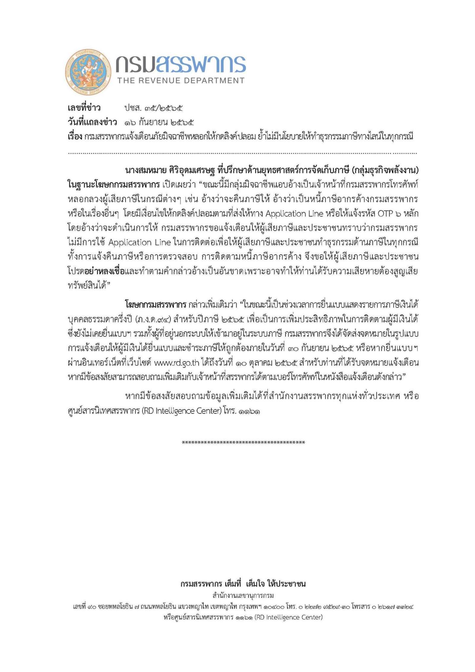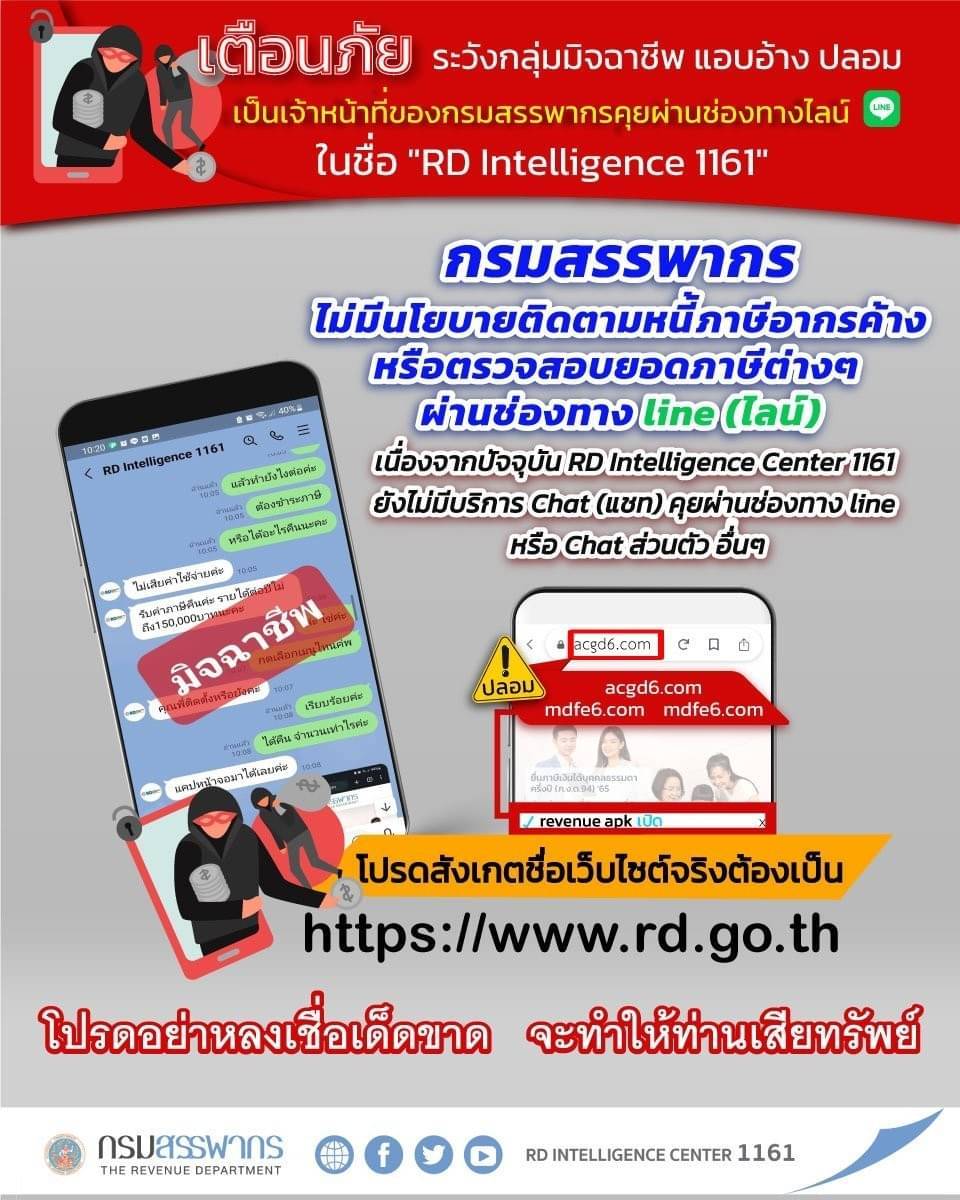 ระวัง! มิจฉาชีพแอบอ้างเป็นเจ้าหน้าที่กรมสรรพากร "เรื่องคืนภาษี" เตือนภัย!!! โปรดระวังกลุ่มมิจฉาชีพแอบอ้างเป็นเจ้าหน้าที่กรมสรรพากร ส่งลิงค์ปลอมให้ทาง Application Line หรือให้แจ้งรหัส OTP 6 หลัก โปรดอย่าหลงเชื่อและทำตามคำกล่าวอ้างเป็นอันขาด เพราะอาจทำให้ท่านได้รับความเสียหายต้องสูญเสียทรัพย์สินได้