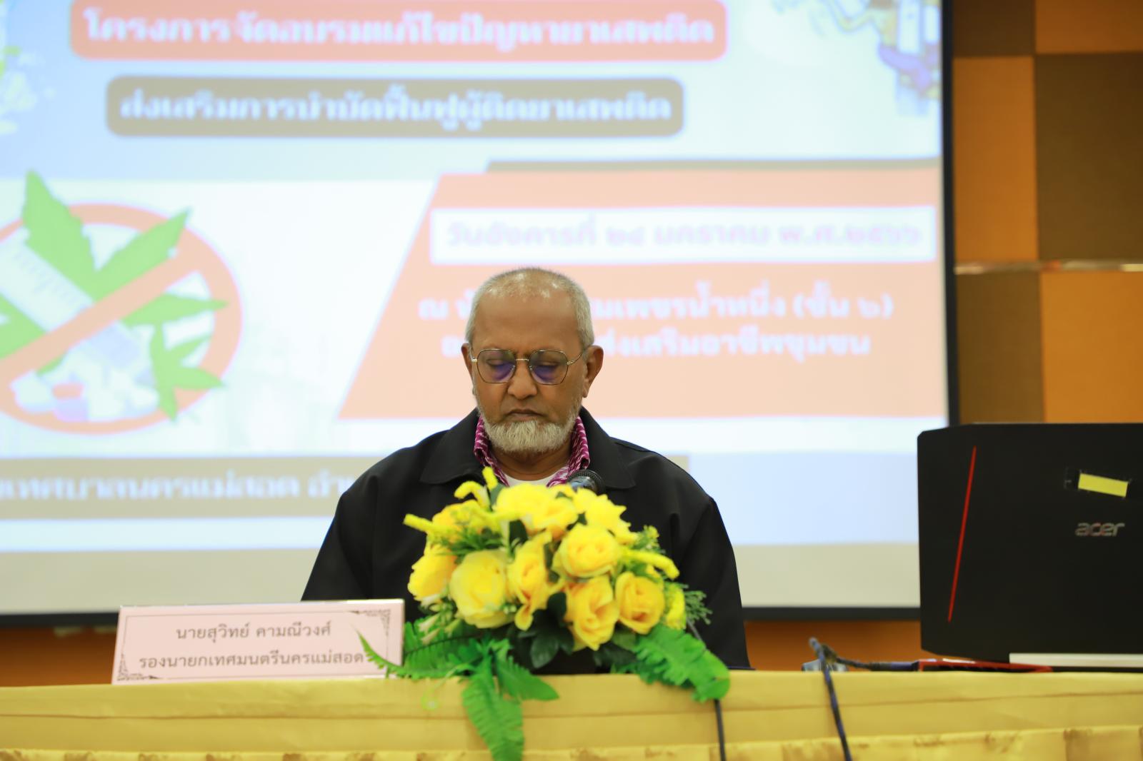 ว่าที่ร้อยตรีประเสริฐ ปวงละคร นายกเทศมนตรีนครแม่สอด มอบหมายให้นายสุวิทย์ คามณีวงศ์ รองนายกเทศมนตรีนครแม่สอด เป็นประธานกล่าวเปิดการอบรม พร้อมด้วยนายชาตรี สุขารมย์ ปลัดเทศบาลนครแม่สอด สมาชิกสภาเทศบาล ผู้อำนวยการกอง หัวหน้าฝ่าย ข้าราชการ และพนักงานเจ้าหน้าที่ที่เกี่ยวข้อง จัดโครงการอบรมแก้ไขปัญหายาเสพติด ส่งเสริมการบำบัดฟื้นฟูผู้ติดยาเสพติด โดยว่าที่พันตรี ดร.ไพฑูรย์ ปริญญาธรรมกุล ผู้อำนวยการกองยุทธศาสตร์และงบประมาณ กล่าวรายงานและวัตถุประสงค์ เพื่อป้องกันไม่ให้กลุ่มเสี่ยงและผู้ผ่านการบำบัดฟื้นฟูหวนกลับไปเสพซ้ำ เป็นการบูรณาการหน่วยงานต่างๆ ที่เกี่ยวข้องให้ความสำคัญกับการบำบัดฟื้นฟูผู้ติดยาเสพติด และอบรมให้ความรู้กับผู้ที่สนใจ กลุ่มเสี่ยงของชุมชนให้ดำรงชีวิตได้อย่างรู้เท่าทันปัญหายาเสพติด ร่วมถึงเพื่อให้การบำบัดรักษาอย่างเป็นระบบและรูปธรรม โดยเป็นการบูรณาการร่วมกันระหว่าง เทศบาลนครแม่สอด สำนักงานคุมประพฤติจังหวัดตาก สาขาแม่สอด สถานีตำรวจภูธรแม่สอด และโรงพยาบาลแม่สอด