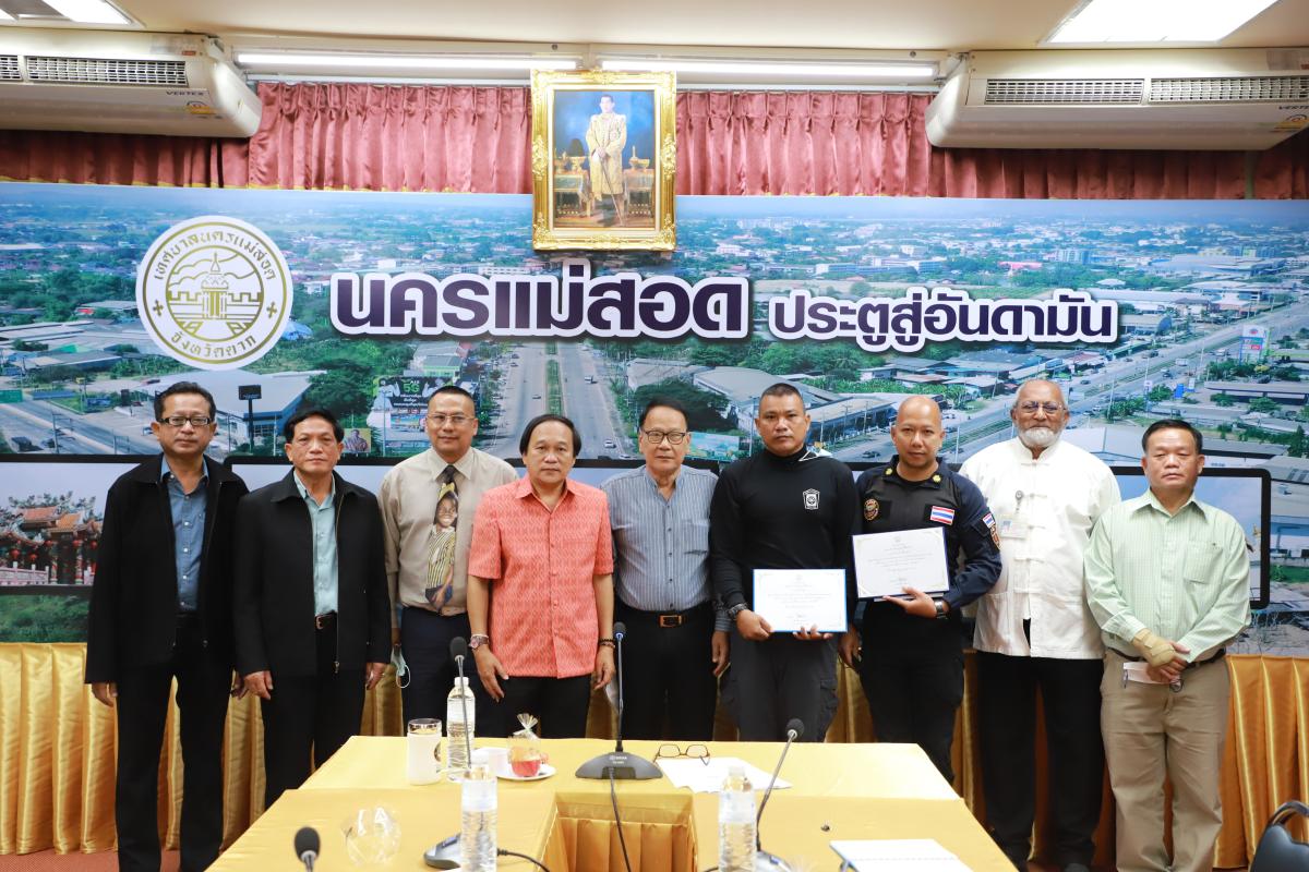 โดยในที่ประชุมได้ทำพิธีมอบใบประกาศเกียรติคุณ เพื่อเป็นขวัญกำลังใจในการปฏิบัติหน้าที่แก่เจ้าหน้าที่ป้องกัน และบรรเทาสาธารณภัยเทศบาลนครแม่สอด ที่ออกปฏิบัติหน้าที่ร่วมช่วยเหลือเด็กหญิงวัย 1 ขวบ ชาวเมียนมา พลัดตกลงไปในท่อส่งน้ำของบ่อบาดาล ลึกกว่า 10 เมตร อำเภอพบพระ จังหวัดตาก ให้กลับสู่อ้อมกอดของครอบครัวอย่างปลอดภัย