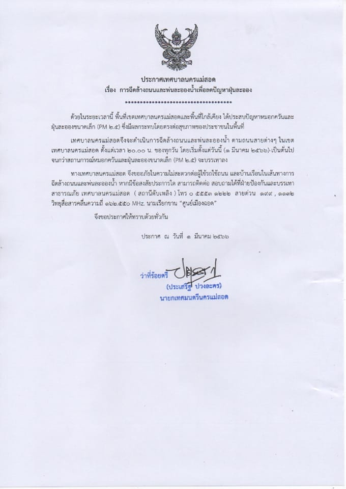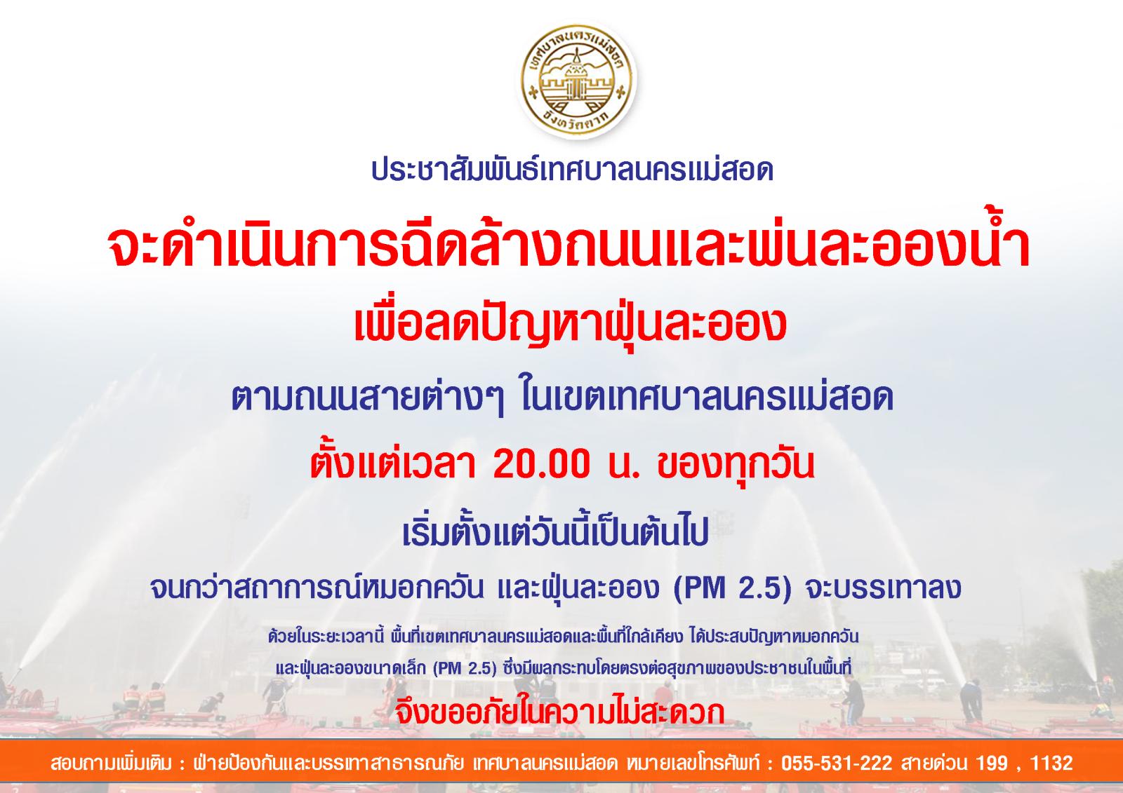 ประกาศเทศบาลนครแม่สอด เรื่องการฉีดล้างถนนและพ่นละอองน้ำเพื่อลดปัญหาฝุ่นละออง